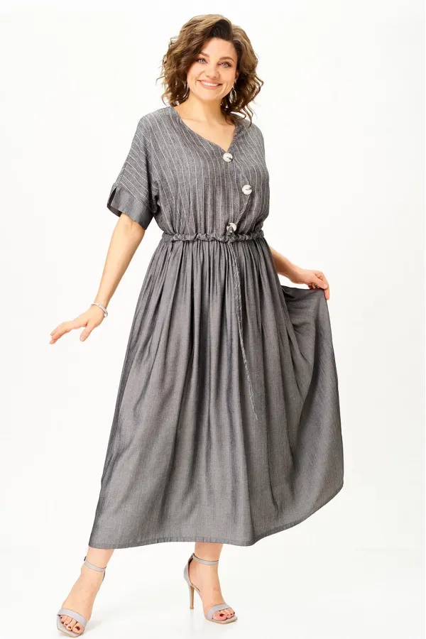 Верх выполнен из лёгкого льна с деликатной полоской, низ — из струящейся вискозы, благодаря чему платье красиво движется при ходьбе и создаёт ощущение лёгкости.
