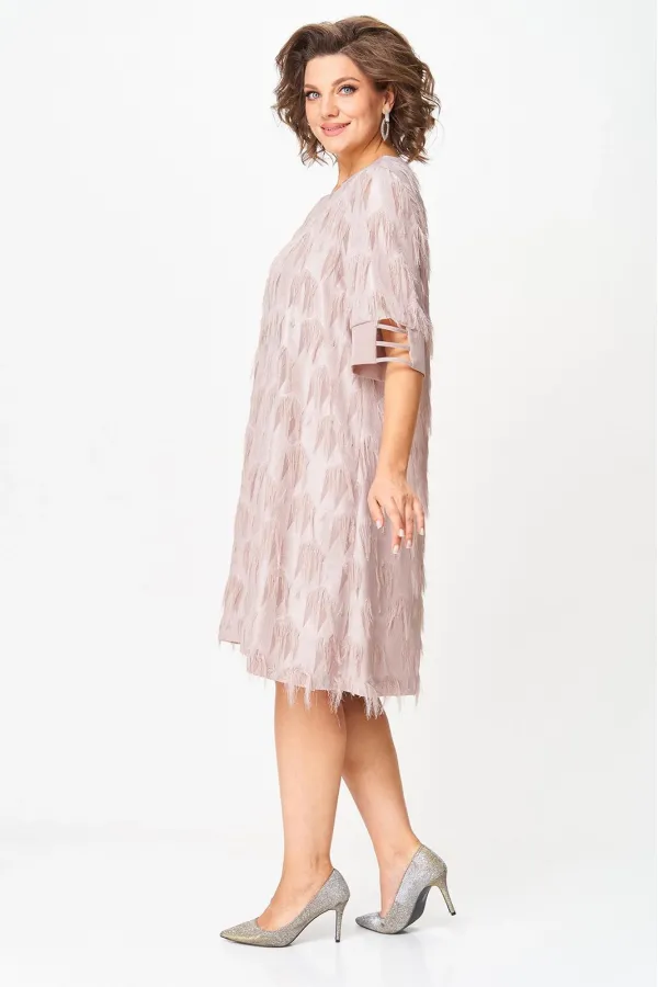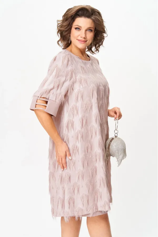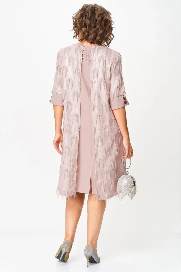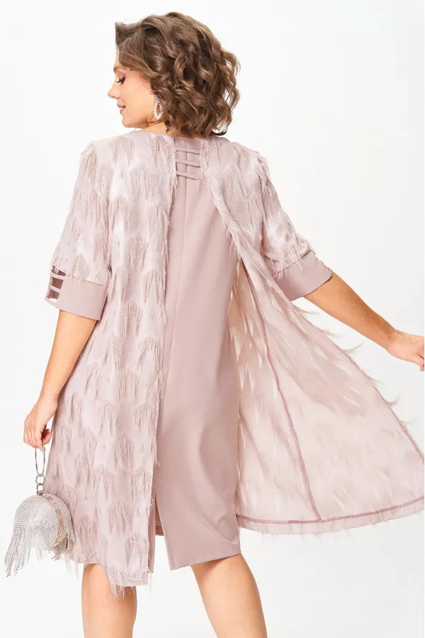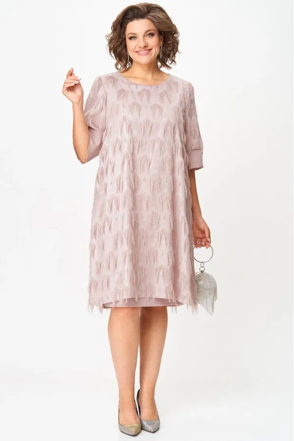 Это платье создано для особых случаев, когда нужно выглядеть безупречно. Снизу — лаконичное платье-чехол из гладкого текстиля, красиво подчёркивающее фигуру, сверху — лёгкий полупрозрачный слой с фактурным узором «реснички» и деликатным мерцанием. Такой тандем создаёт эффект глубины и воздушности, образ выглядит нарядно и дорого. Свободный верх дарит комфорт и мягко скрывает всё лишнее, а длина миди делает силуэт элегантным и женственным. Универсальный оттенок легко сочетается с обувью и аксессуарами.