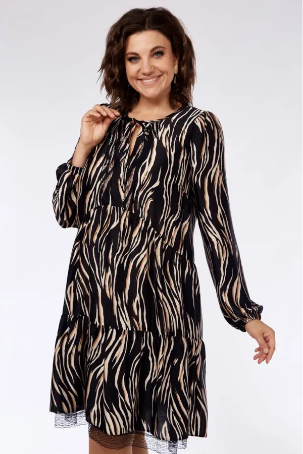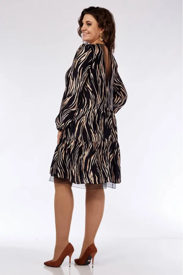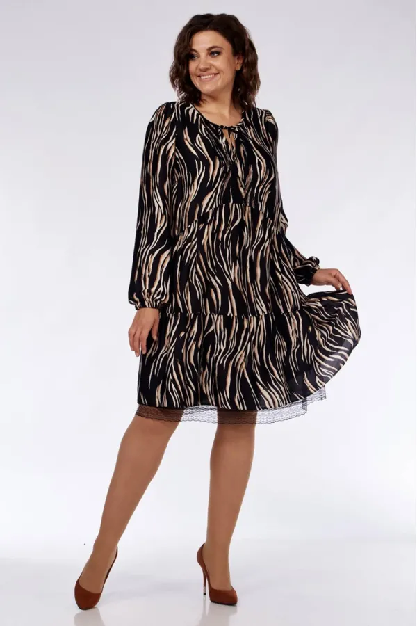 Платье женское свободного силуэта. Округлый вырез горловины, на завязках. Рукав втачной, со сборкой, по низу-на резинке. Изделие с подрезами, со сборкой. По спинке-декоративный вырез с кружевом. Нижний валан платье выполнен из сетки с кружевом. Длина по спинке-93см, длина рукава-63см
