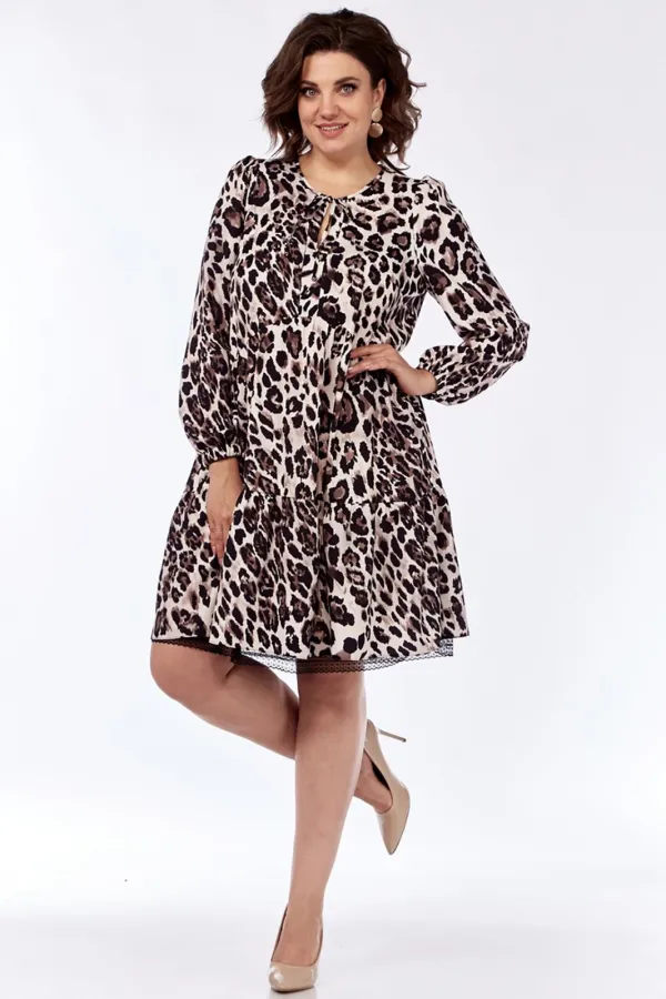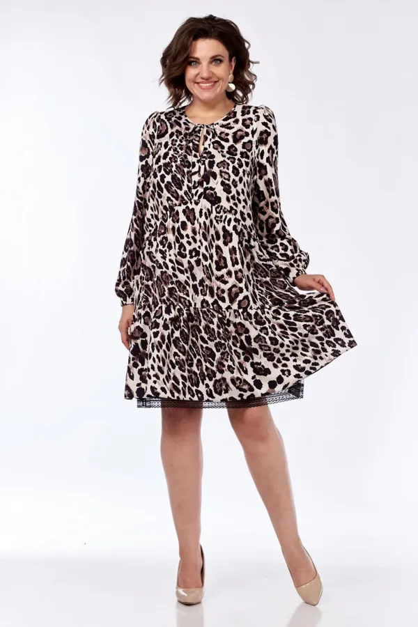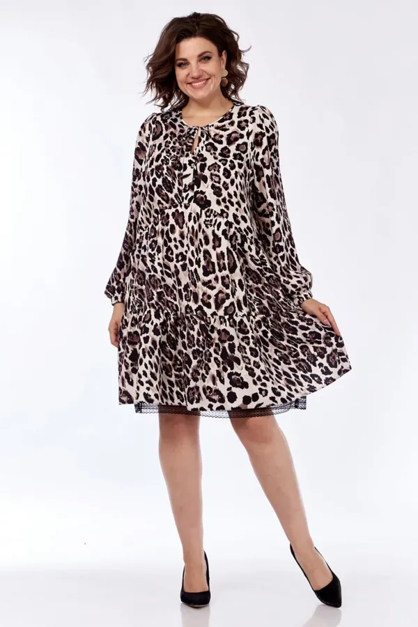 Платье женское свободного силуэта. Округлый вырез горловины, на завязках. Рукав втачной, со сборкой, по низу-на резинке. Изделие с подрезами, со сборкой. По спинке-декоративный вырез с кружевом. Нижний валан платье выпол... Читать далее...