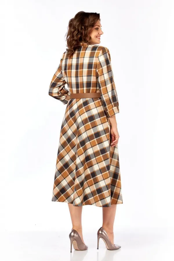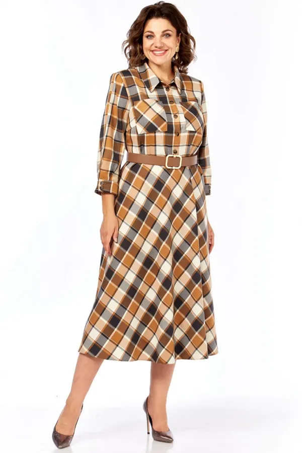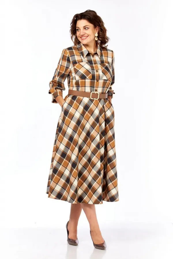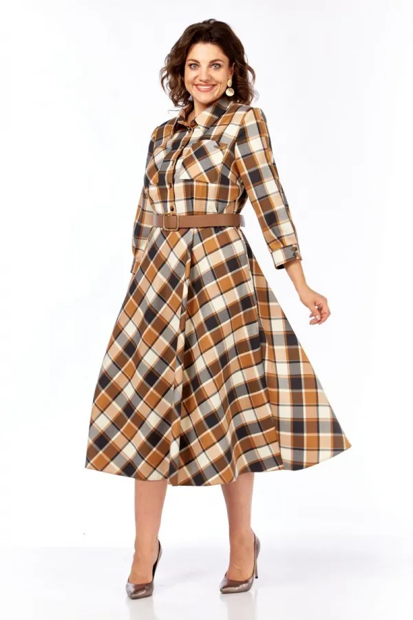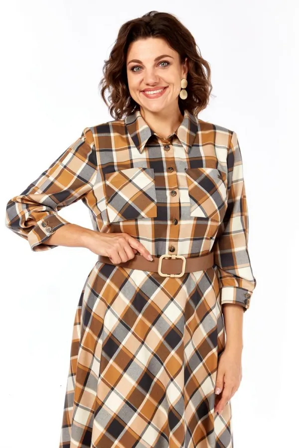 Платье женское полуприлегающего силуэта. По талии отрезное. Спереди застежка на петли и пуговицы и накладные карманы на груди. Имеет отложной рубашечный воротник, втачной рукав длины ¾ со складками по низу, который заканчивается манжетой с застежкой на две пуговицы. Юбка – полусолнце, в боковых швах карманы. В комплекте к изделию идет ремень.