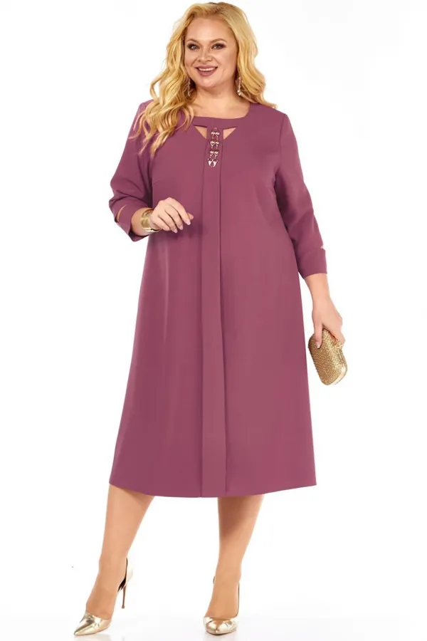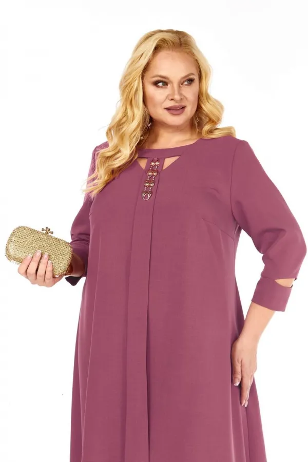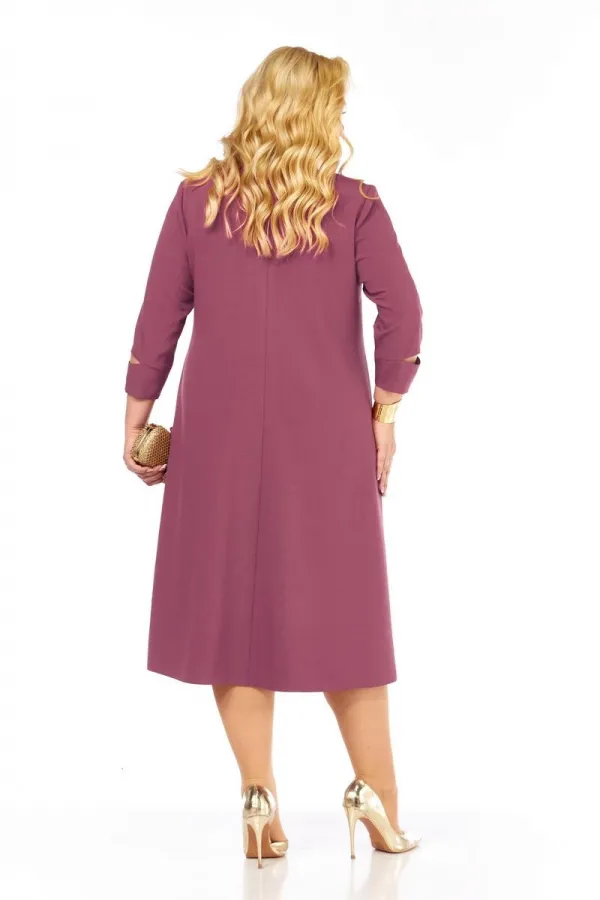 Нарядное платье длины миди, А-образного силуэта, без подкладки. Вырез горловины V-образный c дополнительными декоративными деталями – планками, украшен нашивной золотой деталью. На полочке спереди застрочена вертикальная складка, которая создает эффект удлинения силуэта. Рукава длиной ¾, с декоративными вырезами на внешней стороне руки. С карманами-хулиганами в боковых швах.