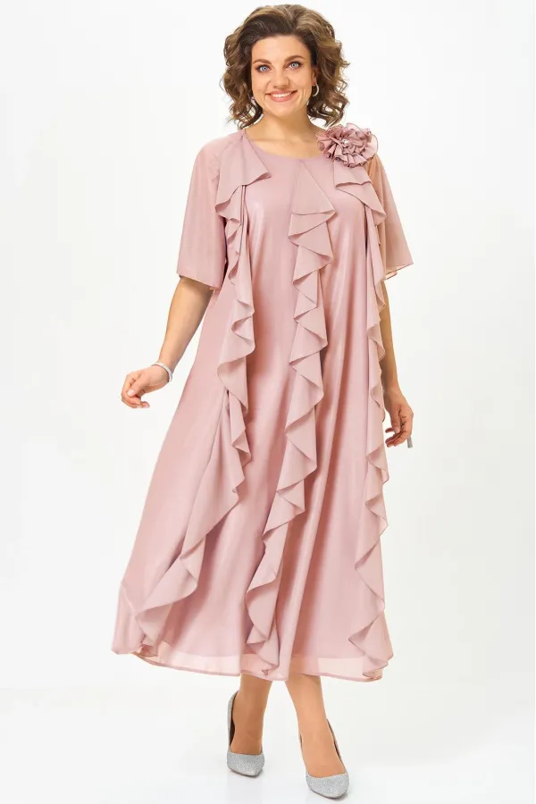 Эффектное платье для обладательниц роскошных форм, свободного покроя, выполнено из шифона, на трикотажной подкладке. Горловина платья округлой формы, на обтачке, на переднем полотнище выполнены вертикальные подрезы с воланами. Спинка со средним швом, рукав покроя реглан, расклешенного покроя, по горловине декор в виде съемного цветка. Легкое, нарядное платье отличный вариант для любительниц комфортных и изящных нарядов!