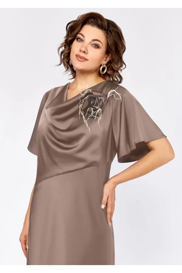Эффектное, женское платье полу-прилегающего силуэта выполнено из атласа. На полочке выполнены ассиметричные подрезы, горловина свободного покроя-«качели», декорирована съемным цветком. Спинка также с ассиметричными подрезами, рукав втачной, укороченный. Эффектное и стильное платье с ярким декором отличный вариант для любого мероприятия!