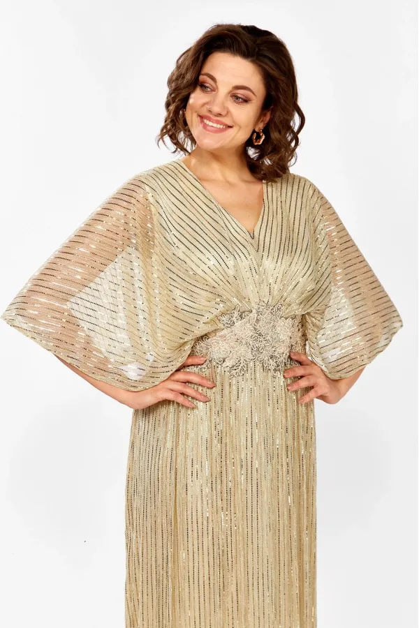 Нарядное женское платье, полу-прилегающего силуэта, выполнено из плиссированной ткани с пайетками. Лиф платья с V-образной горловиной, по линии талии отрезной, на резинке. Лиф платья двойной, нижняя часть из атласа, верхняя часть свободного покроя из плиссированной ткани, со спущенным рукавом, по линии талии декор в виде аппликации из кружева. Юбка расклешенного силуэта, присборена по линии талии, на подкладке. Спинка идентична полочке, отрезная по линии талии, с резинкой. Эффектное платье из яркой ткани отличный выбор для любого мероприятия!