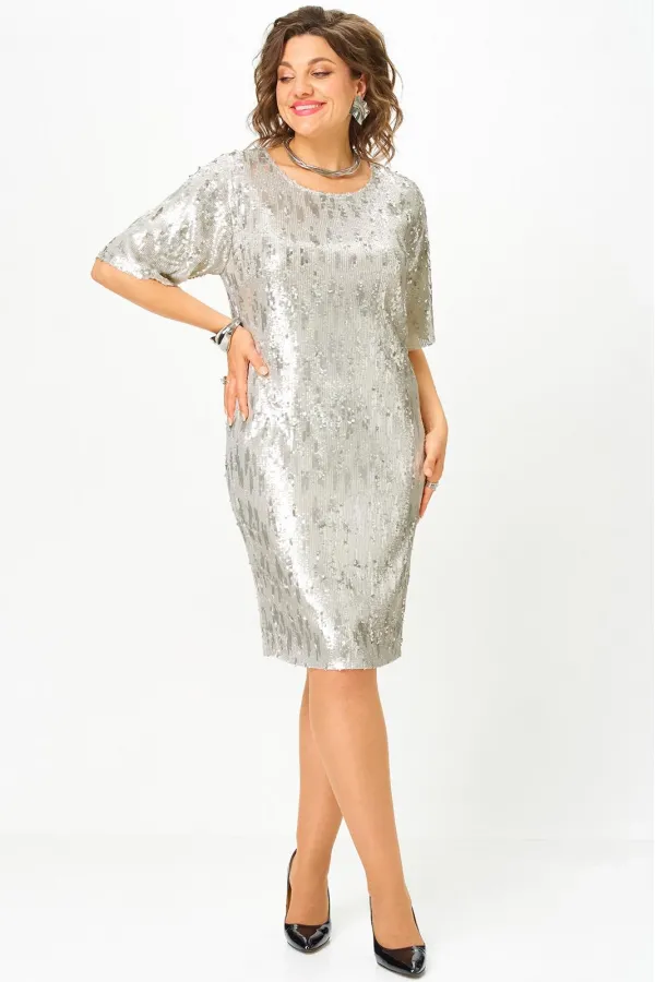 Нарядное платье из пайеток, свободного покроя. Горловина платья округлой формы на обтачке, полочка и спинка свободного покроя. Рукав втачной, укороченный, выполнен из пайеток. Простое в исполнении, но выполненное из эффектной ткани прекрасно дополнит ваш образ!