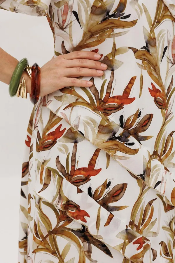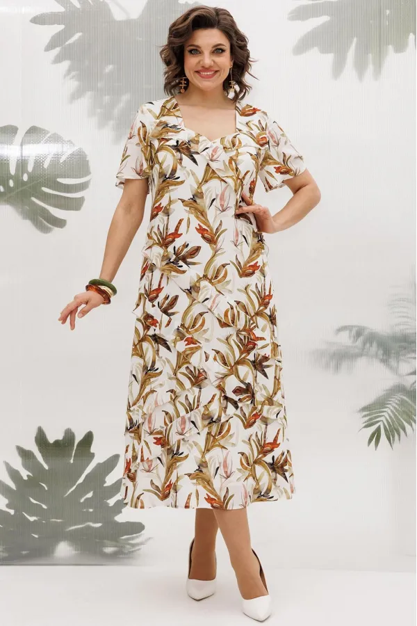 Летнее платье полу-прилегающего силуэта, выполнено из штапеля с принтом, на подкладке. Горловина фигурной формы, на обтачке, также на полочке обработаны кокетки, от кокетки и горловины идут воланы из основной ткани. Также на полочке выполнены ассиметричные подрезы с воланами. Рукав втачной, расклешенный, выполнен из основной ткани, оптимальной длины. Спинка с средним швом и вытачками, в среднем шве потайная молния, платье к низу расклешенное. Легкое, летнее платье из приятной к телу ткани отличный выбор для летнего дня!