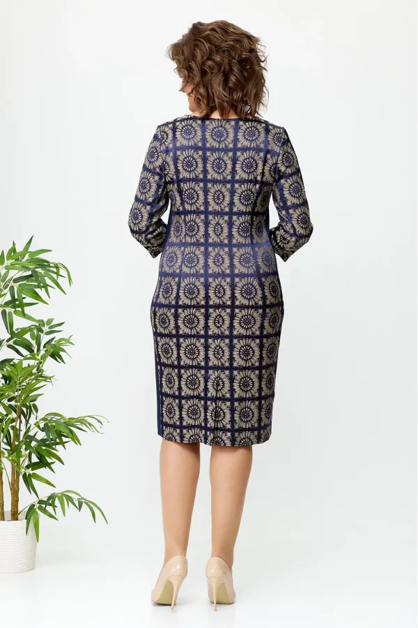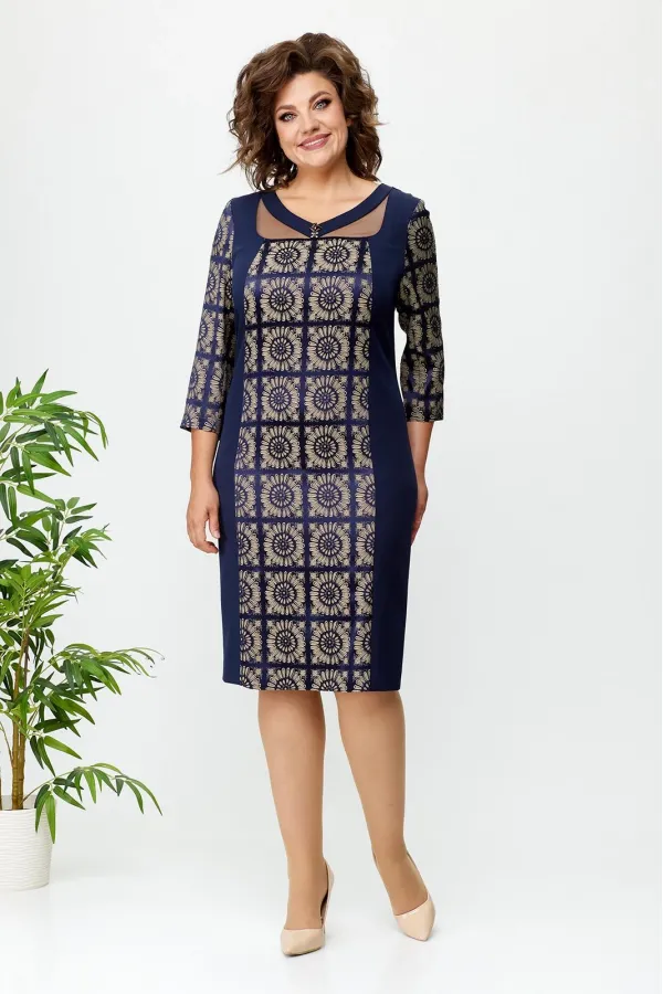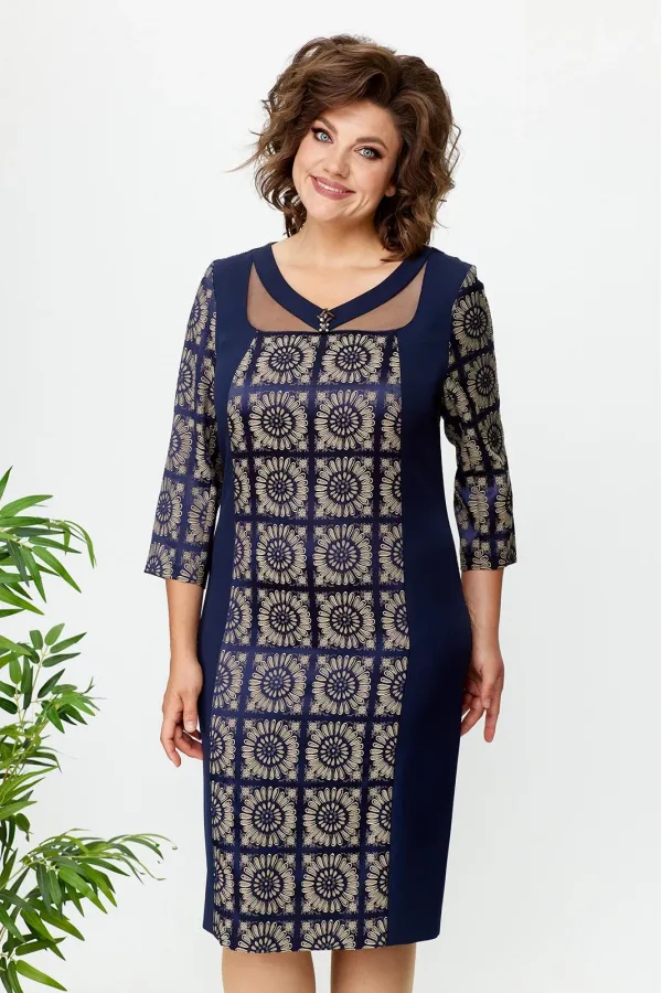 Платье женское полуприлегающего силуэта, без подкладки, молния в среднем шве спинки. Перед с рельефами от горловины, бейка, вставка фигурной формы из сетки. Спинка со средним швом, талиевые выточки, шлица, молния в среднем шве спинки. Рукав втачной. В качестве отделки пришита декоративная брошь по центру бейки переда.