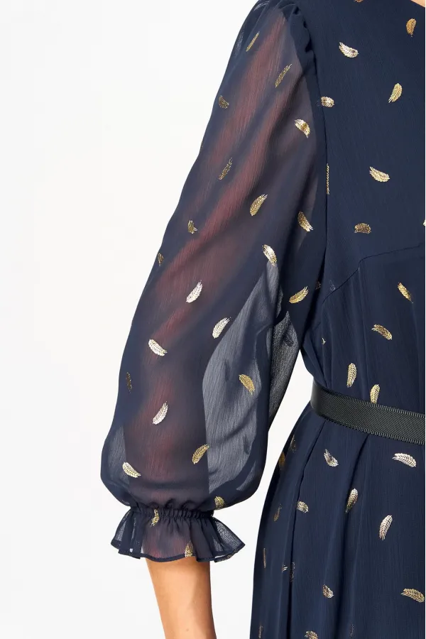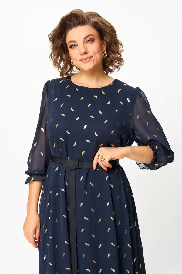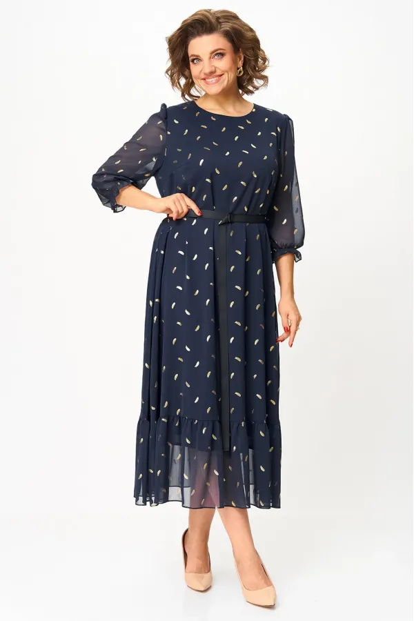 Платье женское А силуэта, на подкладке, без застежки. Перед с нагрудными вытачками. Спинка со средним швом. По низу платья пришит присобраный волан. Рукав свободный, одношовный, втачной, по окату заложена сборка, по низу присобран на эластичную тесьму в 2 ряда, образует манжету. Горловина обработана обтачкой. В дополнении пояс, застегивается на пряжку.