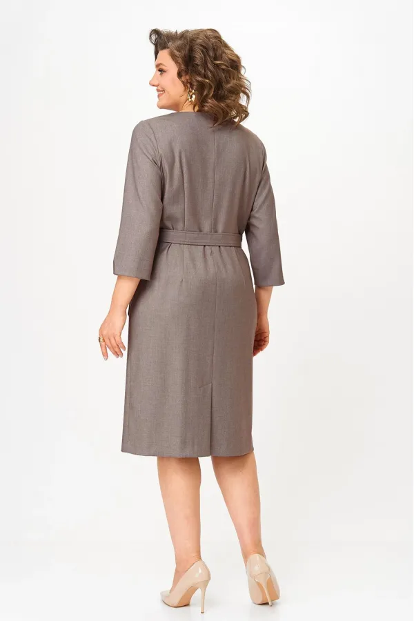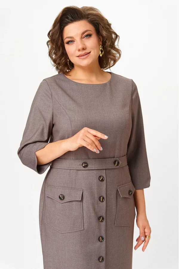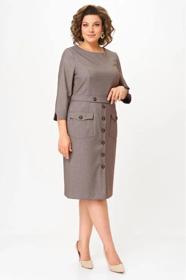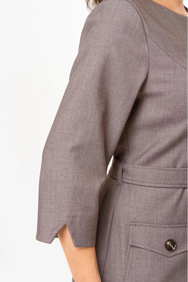 Платье женское полуприлегающего силуэта, без подкладки, тесьма-молния в среднем шве спинки. Перед отрезной по линии талии, рельефы от проймы переходят в талиевые вытачки на нижней части переда, на уровне ниже линии талии пришиты накладные карманы с клапанами, застегиваются на петлю и пуговицу. Нижняя часть переда с планкой, закреплена пуговицами. Спинка со средним швом, переходящим в шлицу, талиевые вытачки. Рукав одношовный, по низу рукава обработан разрез. Горловина обработана обтачками. На уровне линии талии по боковому шву настрочены шлевки, для пояса. В дополнении пояс из основной ткани, застегивается на две петли и пуговицы.