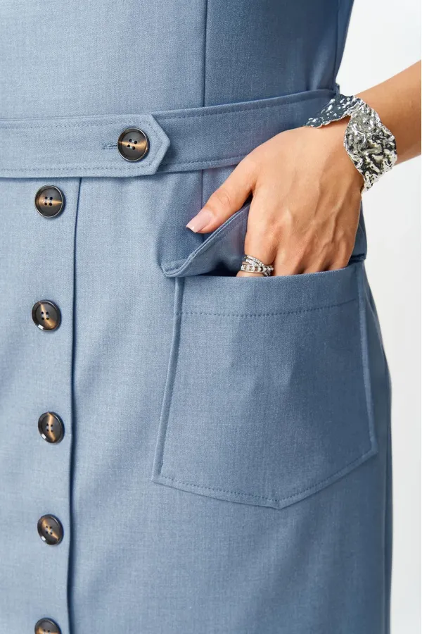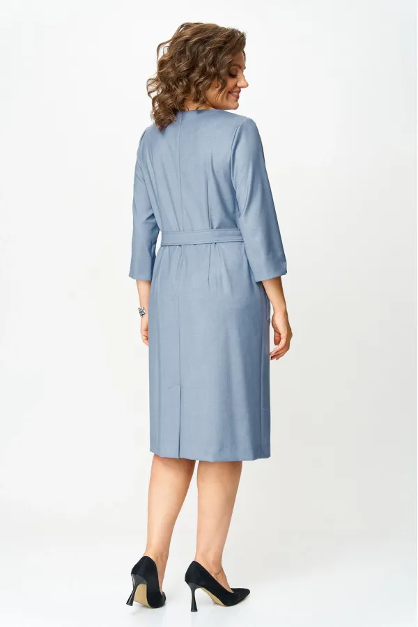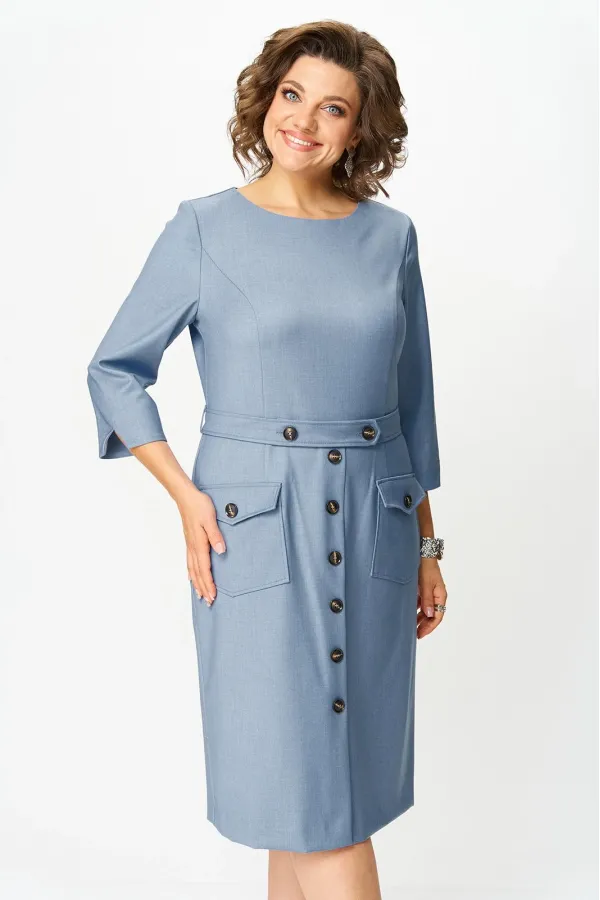 Платье женское полуприлегающего силуэта, без подкладки, тесьма-молния в среднем шве спинки. Перед отрезной по линии талии, рельефы от проймы переходят в талиевые вытачки на нижней части переда, на уровне ниже линии талии пришиты накладные карманы с клапанами, застегиваются на петлю и пуговицу. Нижняя часть переда с планкой, закреплена пуговицами. Спинка со средним швом, переходящим в шлицу, талиевые вытачки. Рукав одношовный, по низу рукава обработан разрез. Горловина обработана обтачками. На уровне линии талии по боковому шву настрочены шлевки, для пояса. В дополнении пояс из основной ткани, застегивается на две петли и пуговицы.