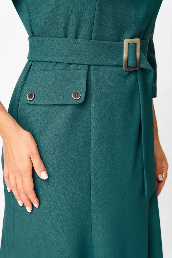 Платье женское полуприлегающего силуэта, без подкладки, тесьма-молния в среднем шве спинки. Перед отрезной по линии талии, рельефы от проймы переходят в талиевые вытачки на нижней части переда, на уровне ниже линии талии пришиты накладные карманы с клапанами, застегиваются на петлю и пуговицу. Нижняя часть переда с планкой, закреплена пуговицами. Спинка со средним швом, переходящим в шлицу, талиевые вытачки. Рукав одношовный, по низу рукава обработан разрез. Горловина обработана обтачками. На уровне линии талии по боковому шву настрочены шлевки, для пояса. В дополнении пояс из основной ткани, застегивается на две петли и пуговицы.