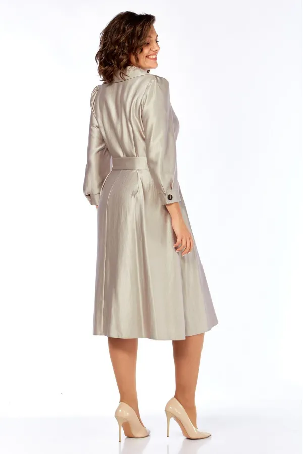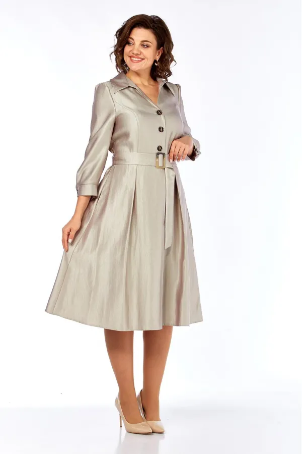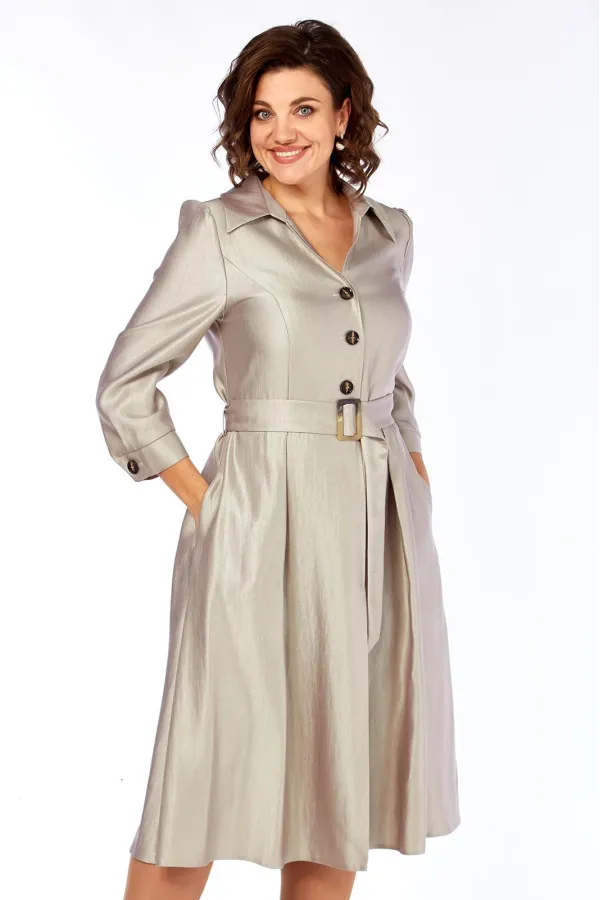 Платье женское полуприлегающего силуэта, расширенное к низу, без подкладки, лиф переда с центрально бортовой застежкой, застегивается на петли и пуговицы, тесьма-молния в левом боковом шве. Перед и спинка отрезные по линии талии. Верхняя часть переда с рельефами от проймы. На нижней части переда встречные складки на уровне рельефов, по центру заложена складка, закреплена отделочной складкой, до уровня бедер. Верхняя часть спинки с талиевыми вытачками. На нижней части спинки встречные складки на уровне талиевых вытачек, средний шов. На уровне линии талии по боковому шву настрочены шлевки, для пояса. Горловина спинки обработана обтачкой. Горловина и край борта переда обработаны планками и подбортом. Воротник стояче отложной с отрезной стойкой. Рукав одношовный, втачной, свободный, окат присобран на сборку, по низу рукава заложены две складки, притачная манжета застегивается на петлю и пуговицу. В дополнении пояс из основной ткани, фиксируется пряжкой.