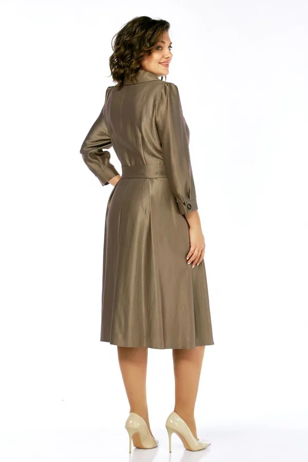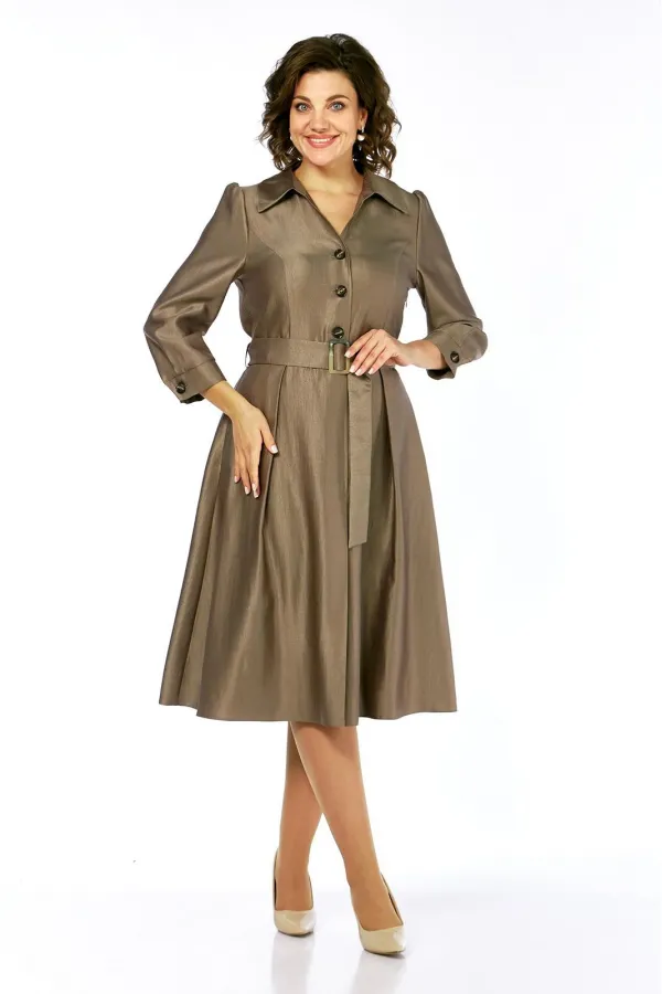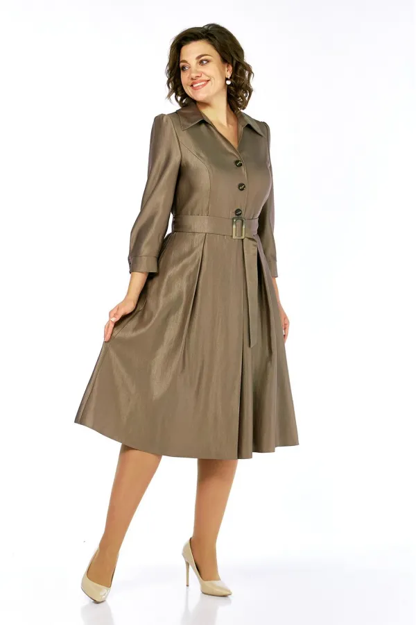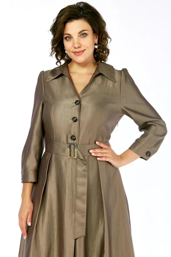 Платье женское полуприлегающего силуэта, расширенное к низу, без подкладки, лиф переда с центрально бортовой застежкой, застегивается на петли и пуговицы, тесьма-молния в левом боковом шве. Перед и спинка отрезные по линии талии. Верхняя часть переда с рельефами от проймы. На нижней части переда встречные складки на уровне рельефов, по центру заложена складка, закреплена отделочной складкой, до уровня бедер. Верхняя часть спинки с талиевыми вытачками. На нижней части спинки встречные складки на уровне талиевых вытачек, средний шов. На уровне линии талии по боковому шву настрочены шлевки, для пояса. Горловина спинки обработана обтачкой. Горловина и край борта переда обработаны планками и подбортом. Воротник стояче отложной с отрезной стойкой. Рукав одношовный, втачной, свободный, окат присобран на сборку, по низу рукава заложены две складки, притачная манжета застегивается на петлю и пуговицу. В дополнении пояс из основной ткани, фиксируется пряжкой.