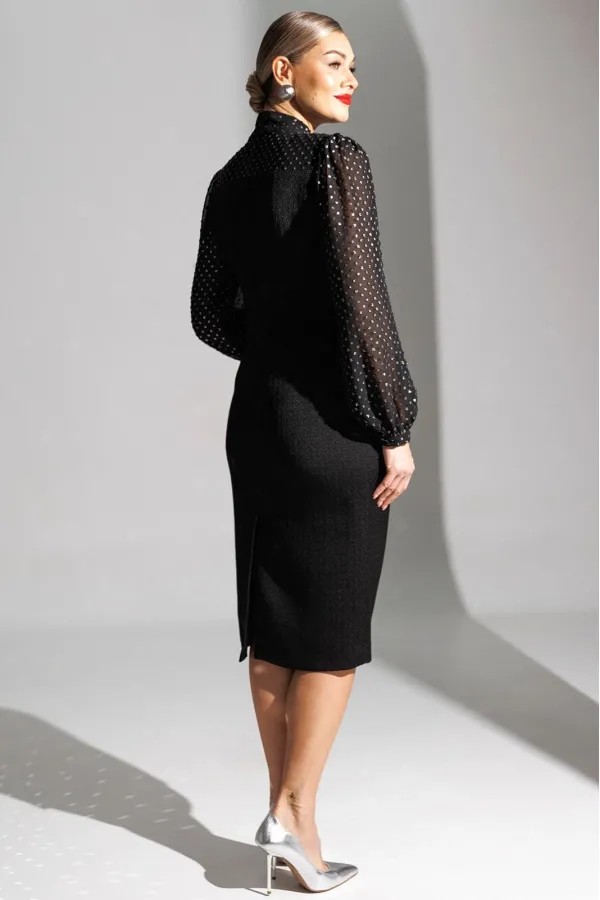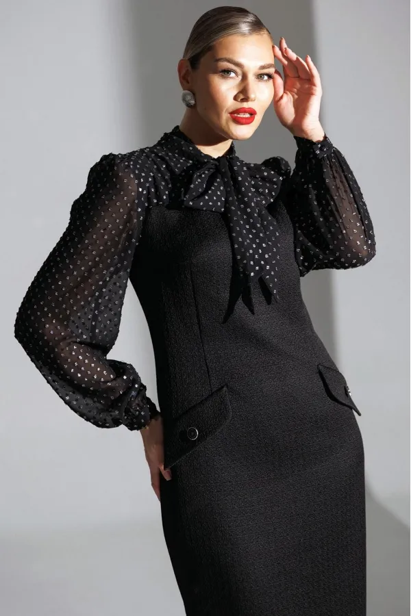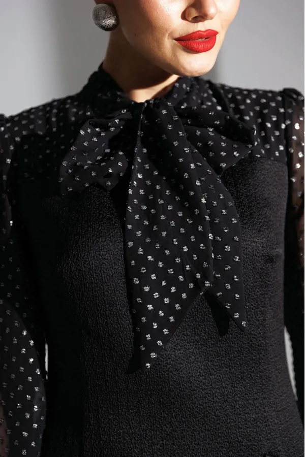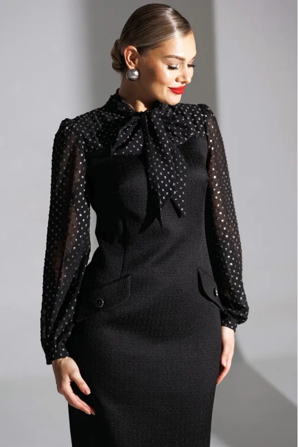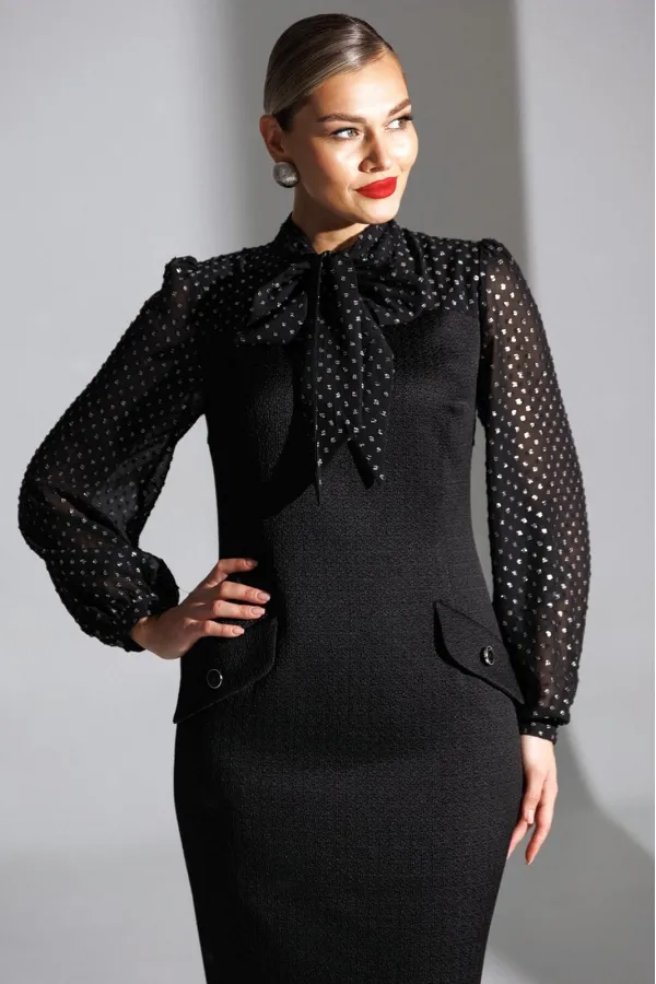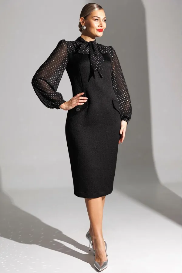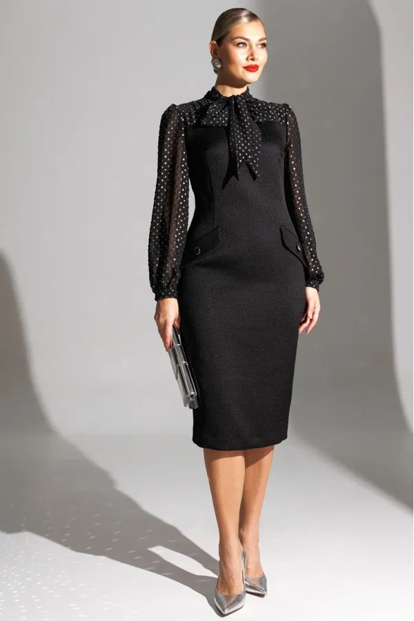 Платье прилегающего силуэта, с накладными декоративными клапанами по переду. Рукав одношовный, со сборкой по низу и на манжете, сборка по верхней части рукава. Рукав, кокетка переда и спинки, воротник-бант выполнены из ткани шифон в горошек. Воротник-бант декоративный , с длинными хвостами. По задней половинке с талиевыми вытачками и шлицей.