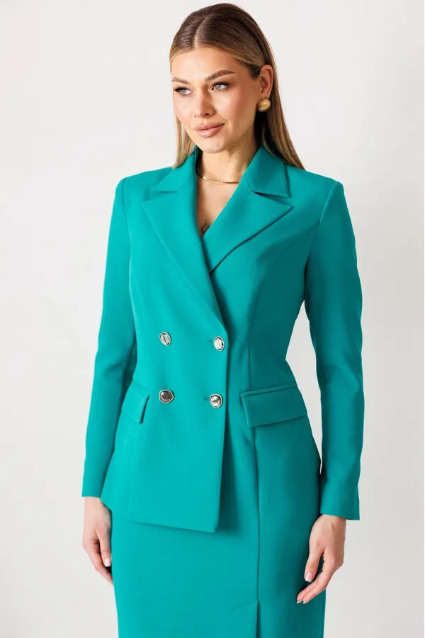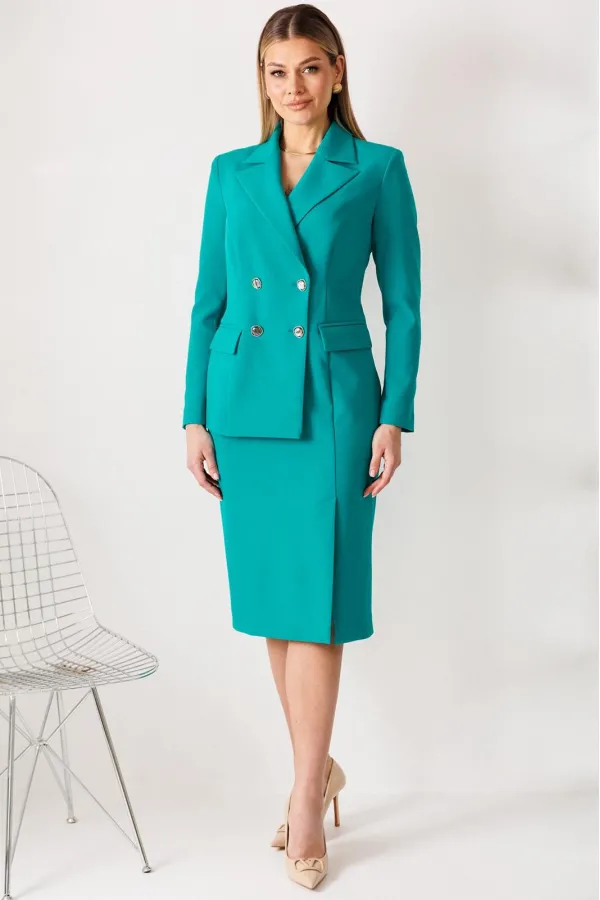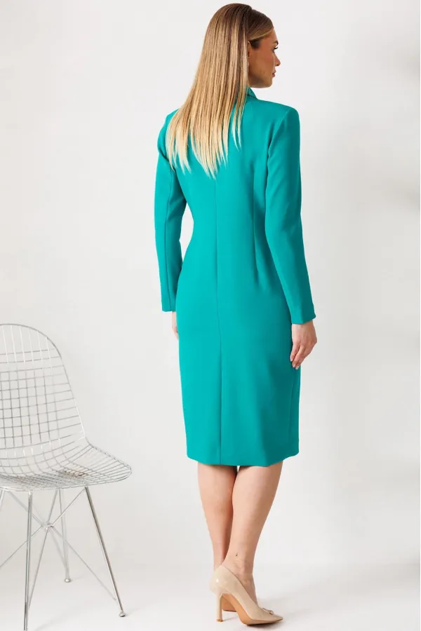 Сомневаетесь, выбрать для важной встречи строгий костюм или элегантное платье? Предлагаем блестящий компромисс! Платье-блейзер полуприлегающего силуэта, длиной ниже колена. Имитация жакета придаёт деловой стиль. Воротник пиджачного типа. Застёжка двубортная на 2 пары пуговиц, в левом боковом шве- потайная молния. На полочке присутствует рельеф из проймы до низа,в котором обработана шлица, обработаны карманы «в рамку с клапаном». Спинка со средним швом и талевыми вытачками. Рукава длинные, двушовные. Платье частично на подкладке. Вы получаете весь эффект от сложного ансамбля, минуя лишние сложности. Платье подчеркивает Ваш статус и деловой настрой.