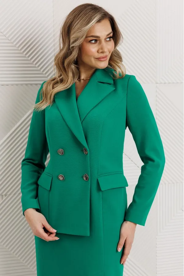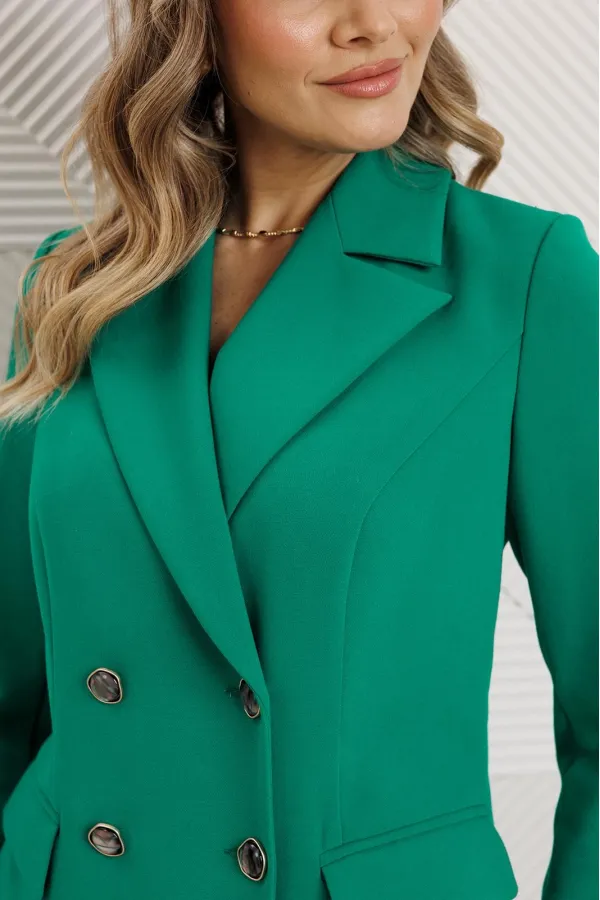 Сомневаетесь, выбрать для важной встречи строгий костюм или элегантное платье? Предлагаем блестящий компромисс! Платье-блейзер полуприлегающего силуэта, длиной ниже колена. Имитация жакета придаёт деловой стиль. Воротник пиджачного типа. Застёжка двубортная на 2 пары пуговиц, в левом боковом шве- потайная молния. На полочке присутствует рельеф из проймы до низа,в котором обработана шлица, обработаны карманы «в рамку с клапаном». Спинка со средним швом и талевыми вытачками. Рукава длинные, двушовные. Платье частично на подкладке. Вы получаете весь эффект от сложного ансамбля, минуя лишние сложности. Платье подчеркивает Ваш статус и деловой настрой.