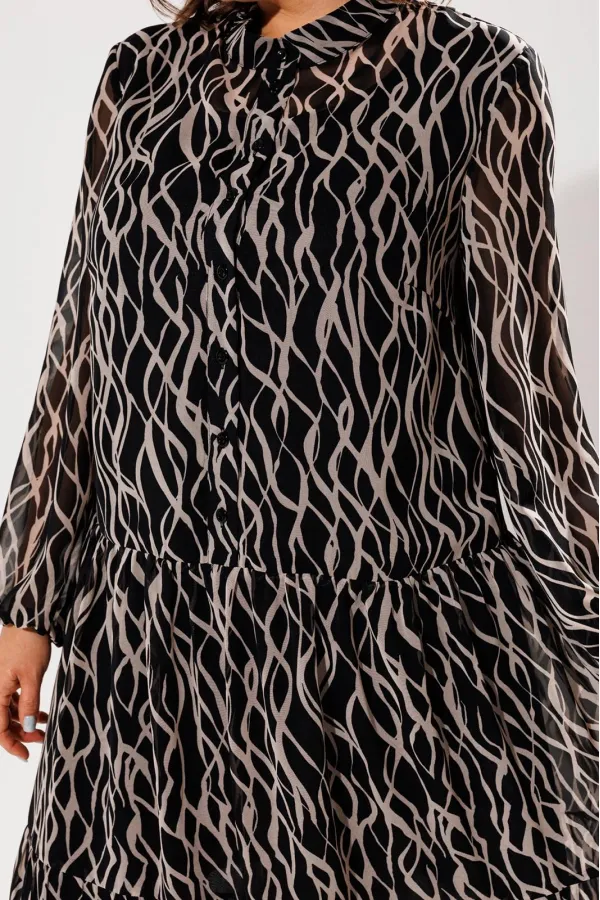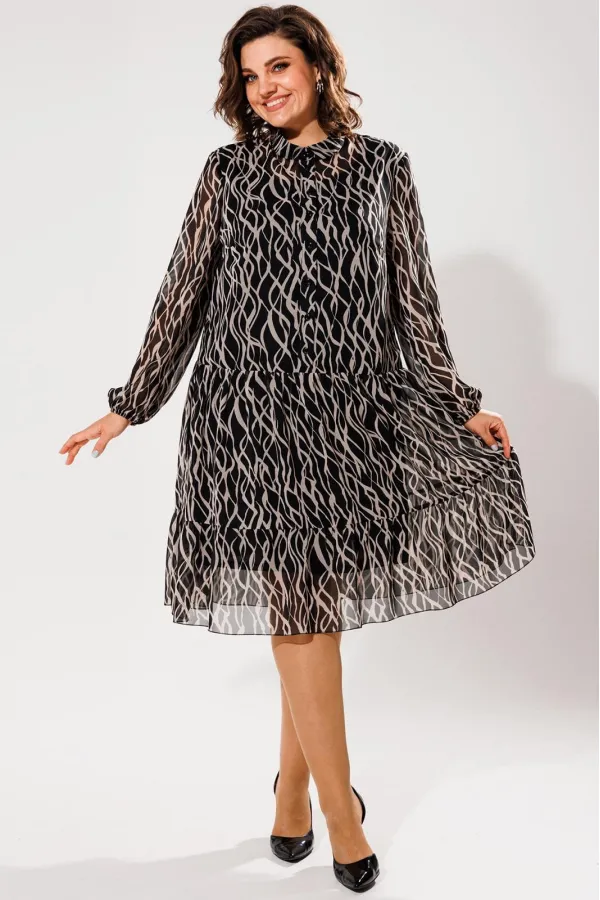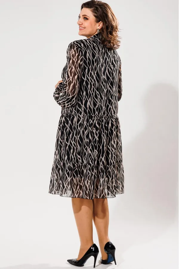 Нарядное женское платье свободного силуэта, выполненное из шифона (не тянется) на эластичной подкладке. Подкладка соединена с платьем, рукава платья без подкладки. Горловина платья оформлена стойкой. Перед с отрезным лифом, с нагрудными вытачками, с застежкой на отрезной планке петли-пуговицы. По низу платья два ряда присборенных воланов. Рукава втачные, одношовные, по низу собраны на резинку.
