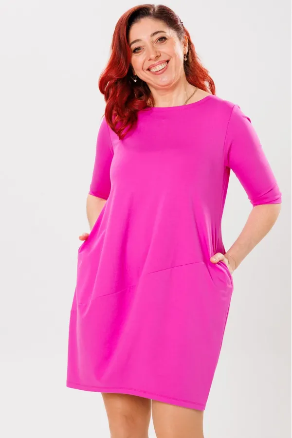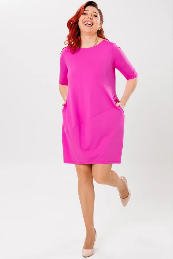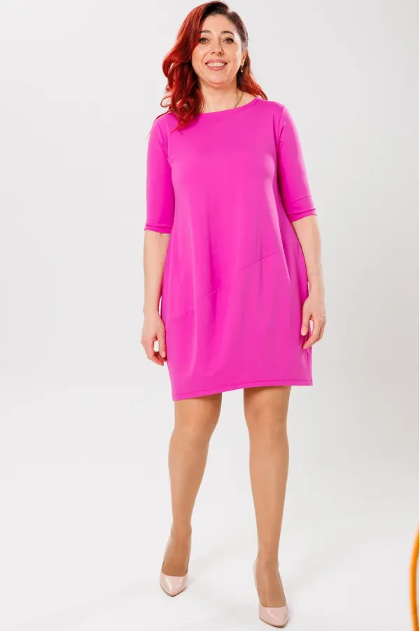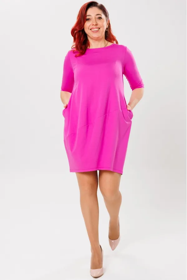 Стильное женское платье-баллон, выполненное из трикотажного полотна (тянется) с легким ненавязчивым блеском. Перед и спинка цельные с косыми подрезами в нижней части. Горловина округлой формы. Рукав втачной одношовный. В боковых швах карманы. Платье без подкладки.