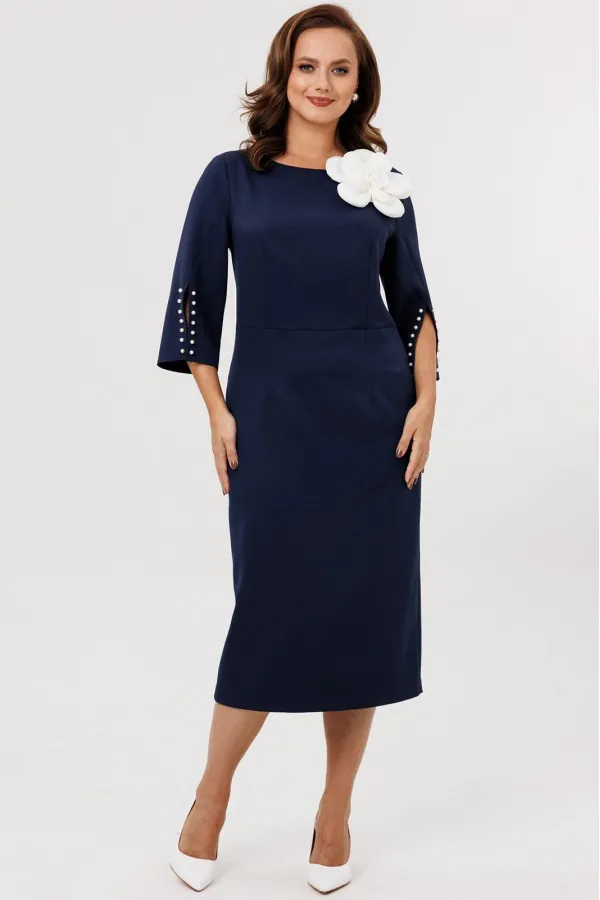 Нарядное женское платье полуприлегающего силуэта, отрезное по линии талии. Выполнено из плательной ткани (чуть тянется). Рукав втачной ¾ с разрезом и декоративными бусинами (жемчуг) по низу рукава. Спинка с застежкой на потайную тесьму-молнию (длина 50 см). По низу платья шлица. Декоративным элементом в платье является съемный цветок. Платье без подкладки.