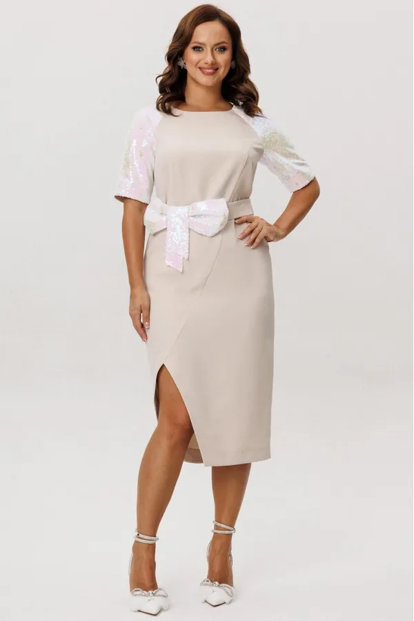 Нарядное женское платье, выполненное из двух видов ткани: плательно-костюмной (тянется ) и плательной с пайетками (тянется). Платье полуприлегающего силуэта, покроя «Реглан». По переду ассиметричный подрез, переходящий в... Читать далее...