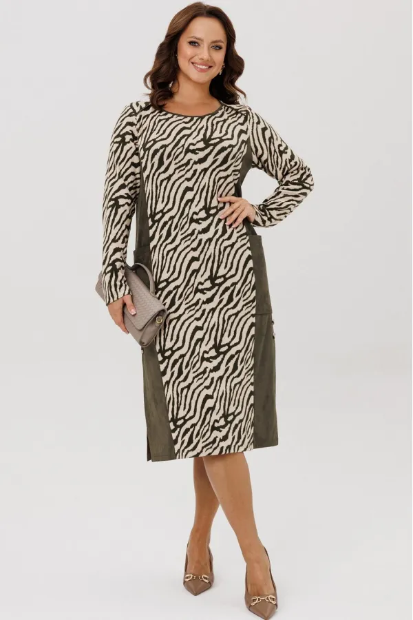 Платье женское полуприлегающего силуэта, выполненное из двух видов ткани: мягкого трикотажного полотна с принтом «Зебра» и плательной ткани «Замша», которые немного тянутся. По переду и спинке отрезной бочок, накладной к... Читать далее...