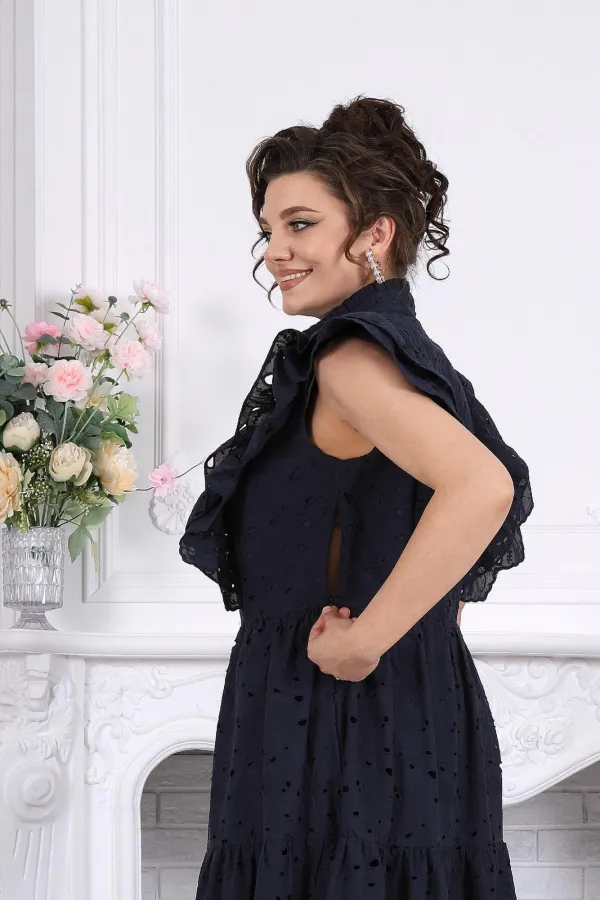 Платье женское из хлопка «ришелье», отрезное по линии талии, с лифом прилегающего силуэта и юбкой. Модель на х/б подкладке, без рукавов и плечевых накладок. Спинка и полочка с рельефными швами, направленными от пройм до талии, вставленными в них двумя воланами, присборенными по всей длине. Нижний волан широкий с фестоном по краю, верхний волан с обработанным краем. Горловина платья с V-образным вырезом по переду, оформлена воротником стойкой с присборенной рюшей по верхнему срезу воротника. По полочке оформлена центральная застёжка на 6 навесных петель и 6 пуговиц. В левом боковом шве застёжка на потайную тесьму-«молнию» (35 см). Юбка платья свободного кроя состоит из трёх присборенных воланов, по краю нижнего волана фестон. Длина платья по среднему шву спинки - см; длина платья по среднему шву спинки (от талии) – 139 см (50-58 р-р).