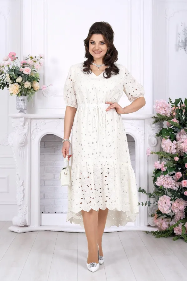 Это платье словно создано для тёплых вечеров, особых встреч и тех моментов, когда хочется выглядеть особенно красиво — нежно, женственно и по-настоящему нарядно. Ажурное хлопковое ришелье придаёт образу изысканность и лёгкость, создавая эффект дорогой, дышащей фактуры с деликатной прозрачностью.