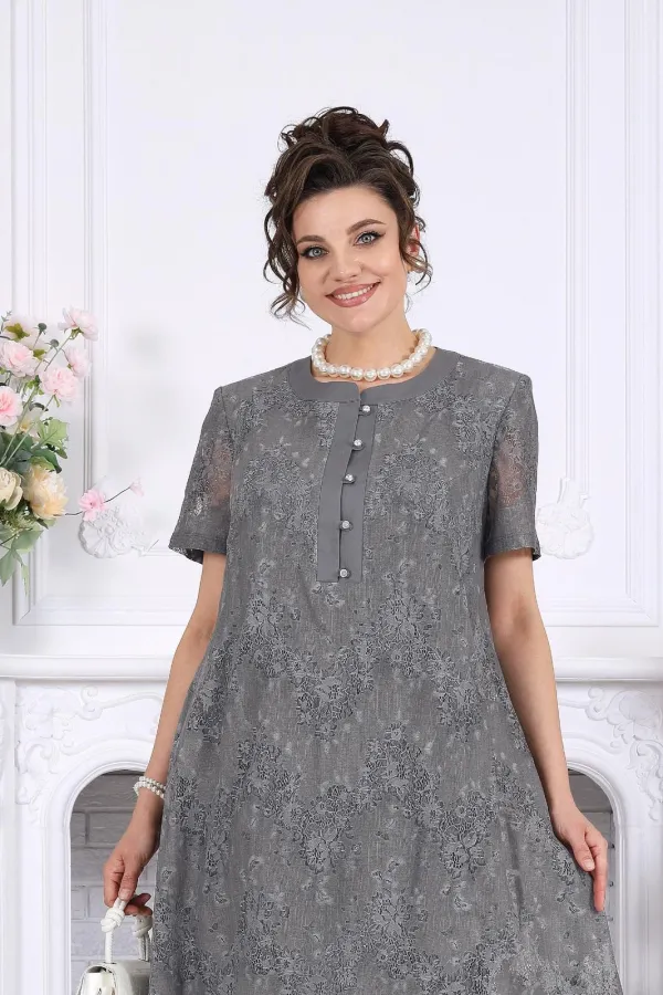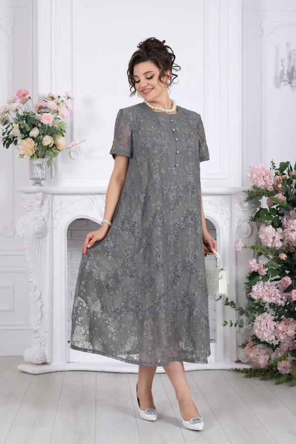Платье женское А-силуэта, выполнено из гипюра х/б. Модель на х/б подкладке. По центру полочки оформлена застежка с притачными планками до линии груди. На планке обработана застёжка на 5 навесных петель и 5 пуговиц. Рукав в платье втачной короткий. Перед с нагрудными вытачками, направленными от пройм. Горловина оформлена воротником стойка. По боковым швам, внизу платья оформлены фигурные разрезы. Длина платья – см (50-54 р-р), см (56-66 р-р); длина рукава- см.