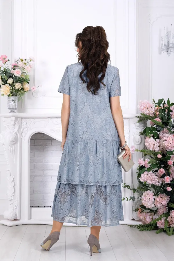 Свободный А-силуэт мягко ложится по фигуре, деликатно скрывая нюансы и создавая красивую линию силуэта. Двухъярусные воланы добавляют образу динамики и лёгкости, а кружевная фактура придаёт глубину и благородство. Короткий рукав делает платье комфортным для тёплого сезона, а натуральная хлопковая подкладка обеспечивает приятные ощущения в течение всего дня.