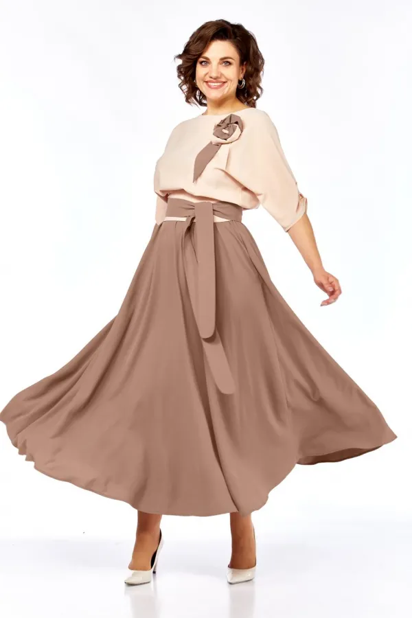Нарядное платье длиной макси свободного силуэта, выполнено из двух оттенков . Отрезное по линии талии, резинка по спинке. Горловина овальной формы, спущеная линия плеча. Нижняя часть платья клеш-полусолнце, карманы в боковых швах. Пояс из основной ткани из двух цветов. Декоративный цветок-брошь ручной работы.