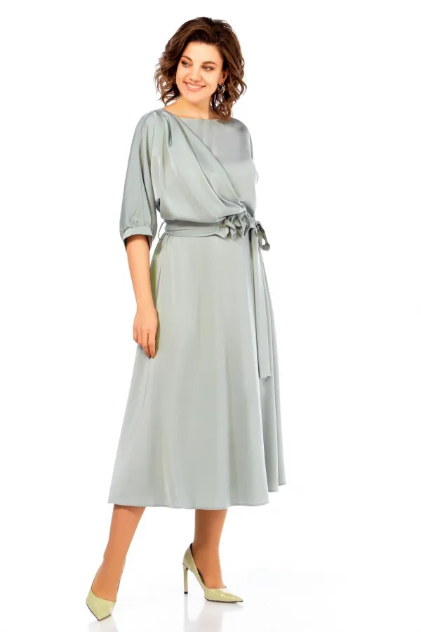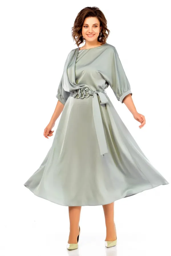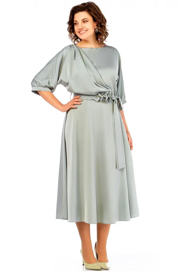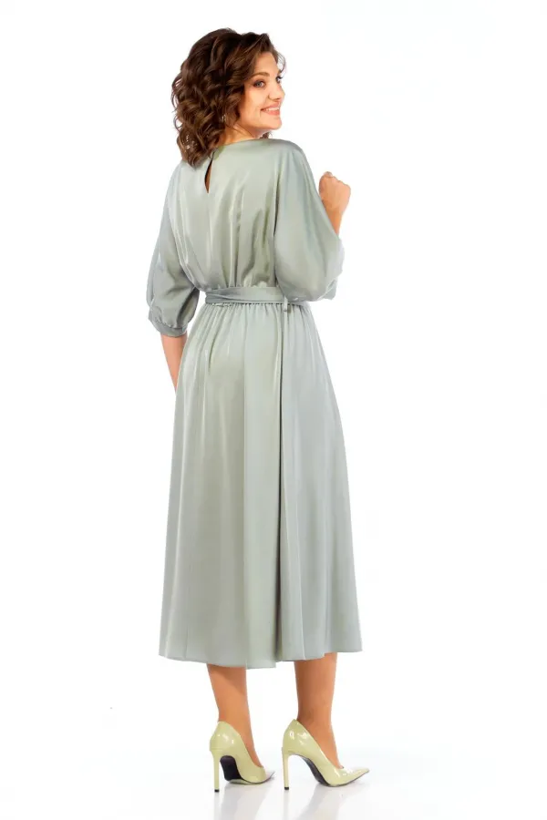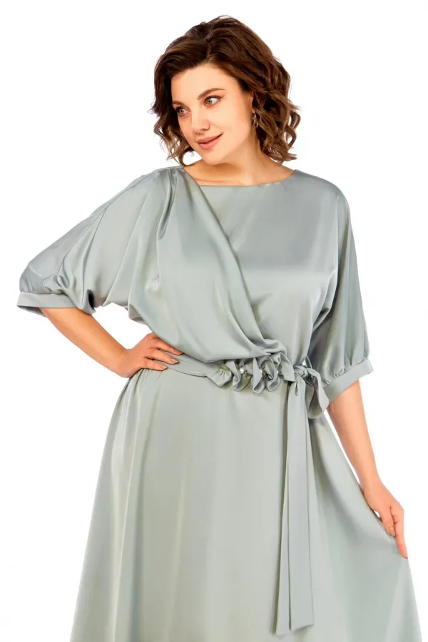 Нарядное платье из струящейся ткани, отрезное по линии талии. Верх летучая мышь, по низу рукава сборка и притачная манжета. Вырез горловины округлой формы. По переду ассиметричная деталь от плеча до линии подреза. По линии подреза резинка. Нижняя часть платья клеш. К платью прилагается интересный пояс, украшенный стразами.