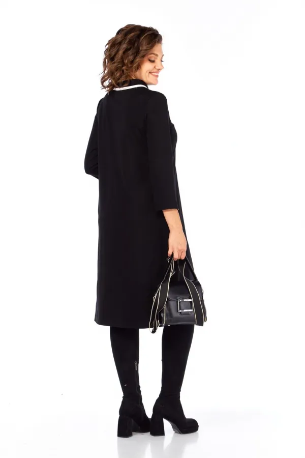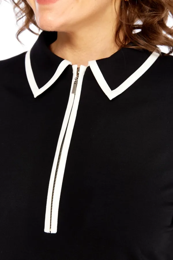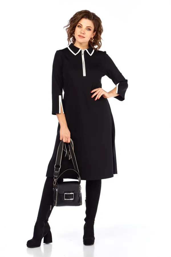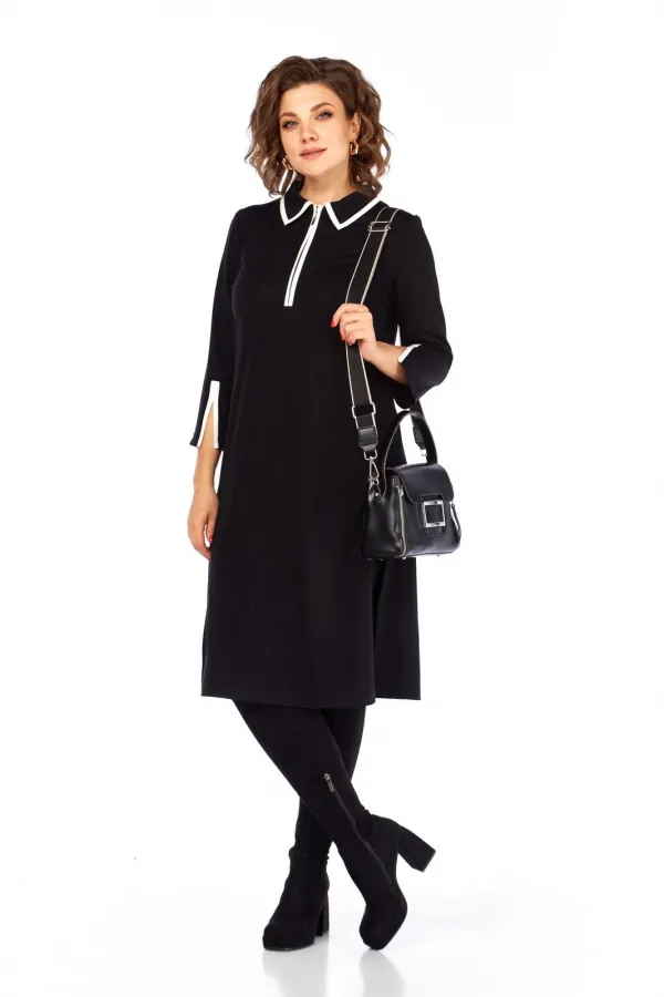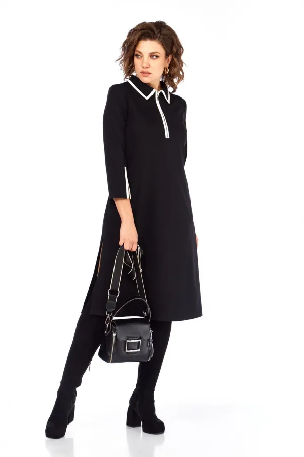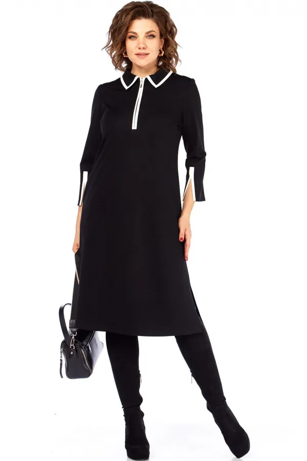 Интересное плать из премиального трикотажного полотна, с воротником поло и застежкой-молнией по центру. Контрастная отделка, А-силуэт, разрезы в боковых швах. Рукав втачной с контрастной отделкой-планкой по низу.