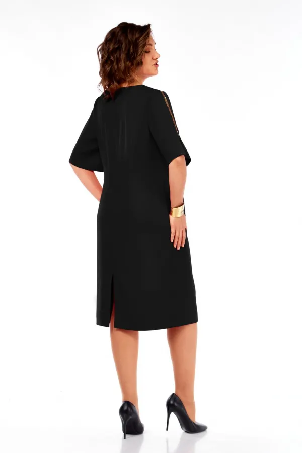 Очень интересное нарядное платье, полуприлегающего силуэта. Полочка украшена втачной тесьмой в золотом цвете, по центру до подреза. По спинке средний шов, потайная молния и разрез. Рукав втачной, длиной ниже линии локтя, по центру втачная декоративная тесьма.