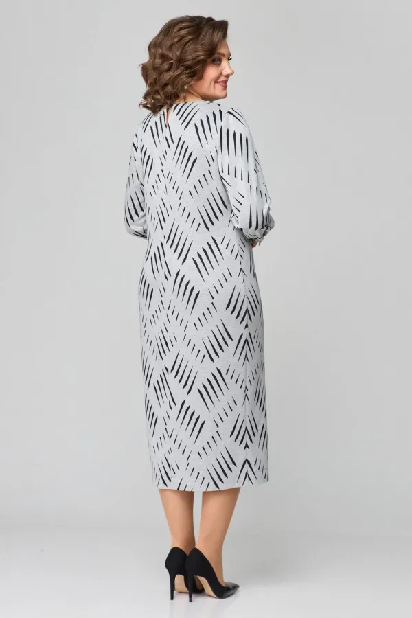 Платье полуприлегающего силуэта, втачного покроя. Горловина округлой формы с капелькой по спинке в среднем шве. Рукав по низу со складками, на манжете на одну пуговицу.