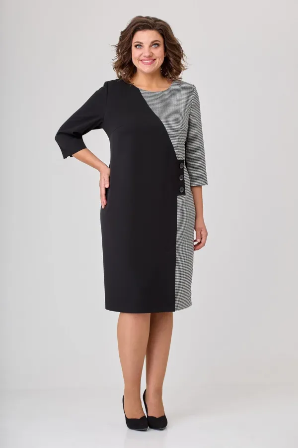 Платье женское полуприлегающего силуэта, втачного покроя. Платье выполнено из двух видов ткани: однотонной (плательно-костюмной группы) и черно-белой отделочной. Горловина в платье округлой формы. Рукава двушовные с разрезом по локтевому шву. Длина рукава ¾. Левый рукав с центральным швом в верхней части рукава. Верхняя центральная часть рукава выполнена из отделочной ткани в поддержку левой боковой части переда, правая часть переда выполнена из однотонной плательной ткани. Шов, соединяющий эти части переходит в имитацию застежки на три пуговицы и далее переходит в шлицу. Спинка цельная с вертикальными талиевыми вытачками. На рукаве над разрезами пришиты декоративные пуговицы.
