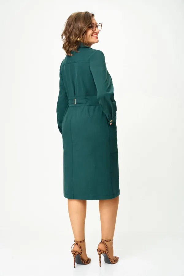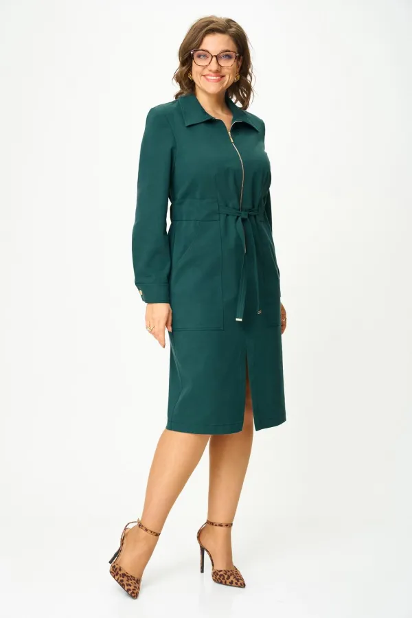 Платье женское, полуприлегающего силуэта, втачного покроя рукава, выполнено из джинсовой ткани. По центру переда вставлена отделочная молния, внизу разрез. Перед отрезной по линии талии, в нижней части с накладными карманами, сверху с нагрудной вытачкой снизу вверх. Спинка так же отрезная по линии талии, нижняя часть со средним швом и талиевыми вытачками, верхняя часть со встречной складкой на уровне талии и кокеткой. На уровне талии настрачивается деталь, через которую на спинке протягивается пояс с пряжкой, по переду пояс завязывается по центру. Рукав длинный, двухшовный, внизу с манжетой, застегивающейся на петлю-пуговицу.