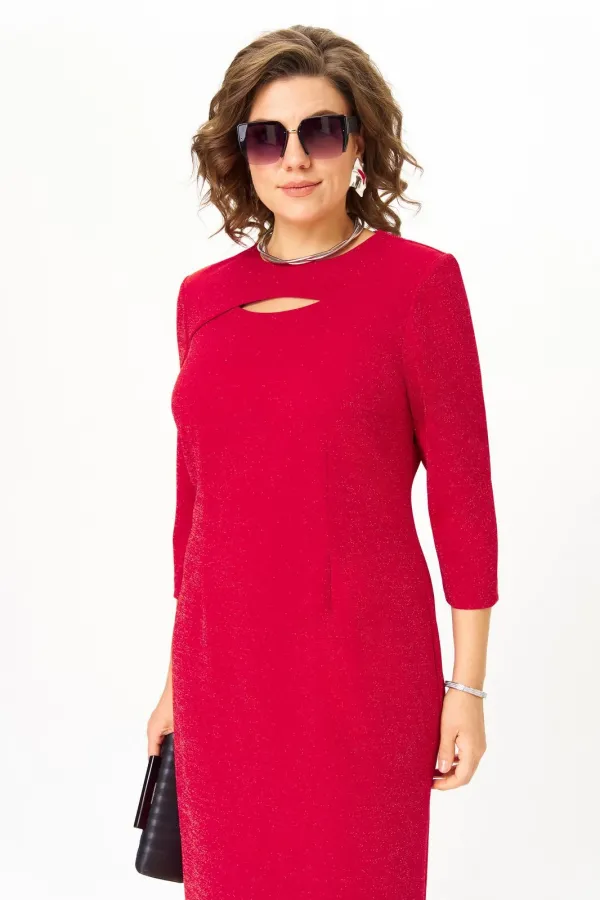 Платье женское, полуприлегающего силуэта, втачного покроя рукава, выполнено из трикотажного полотна с люрексовой нитью. По переду расположены талиевые и нагрудные вытачки, горловина округлой формы с пересекающейся кокетк... Читать далее...