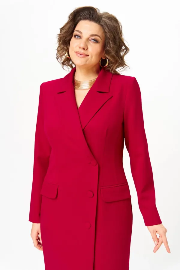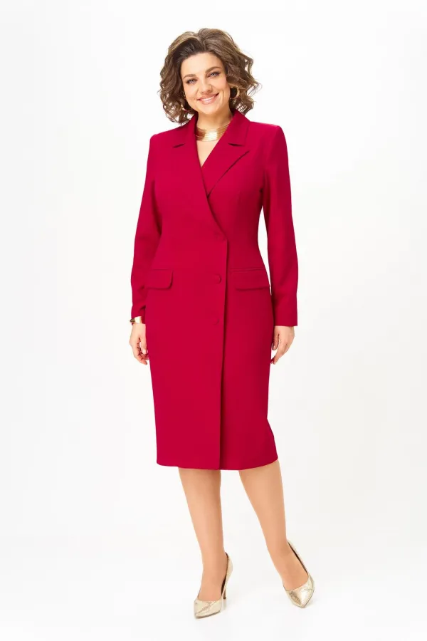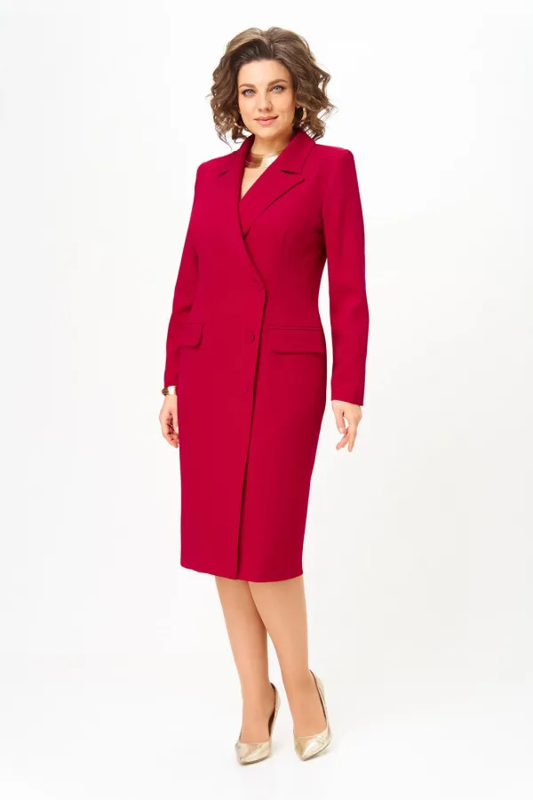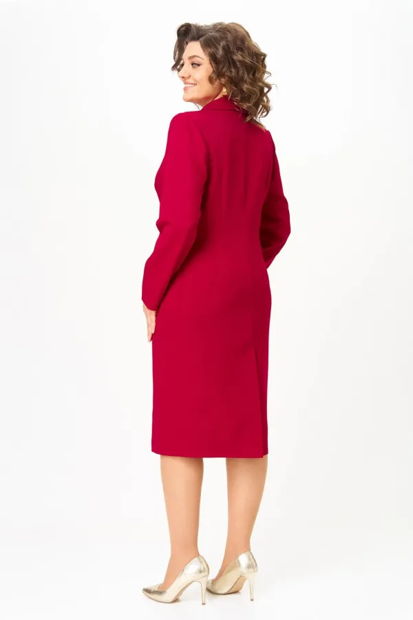 Платье женское, полуприлегающего силуэта, зауженное к низу, с двубортной застежкой на 3 отделочные пуговицы. Правая часть платья имеет слегка наклонную линию. На спинке средний шов, заканчивающийся шлицей и талиевые вытачки. По переду отрезной бочок, заканчивающийся в области бедер и нагрудная вытачка в горизонтальном подрезе, в котором выполнен прорезной карман с двумя рамками и клапаном. Горловина оформлена воротником пиджачного типа. Рукав втачной, одношовный, длинный.