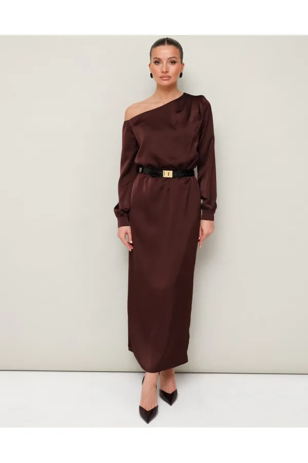Вечернее платье полуприлегающего силуэта, выполнено из струящейся ткани с благородным матовым блеском. Ассиметричный вырез горловины с открытым плечом. Правый плечевой шов декорирован складками. Платье отрезное по линии талии на резинке. Рукава длиннные с манжетами с застежкой на петли и пуговицы. По спинке в среднем шве юбки обработан разрез.
