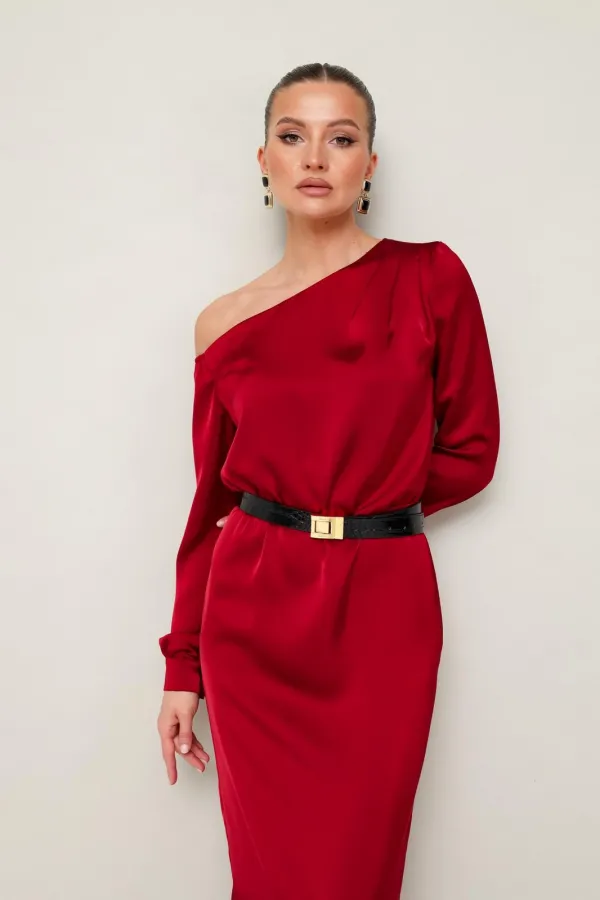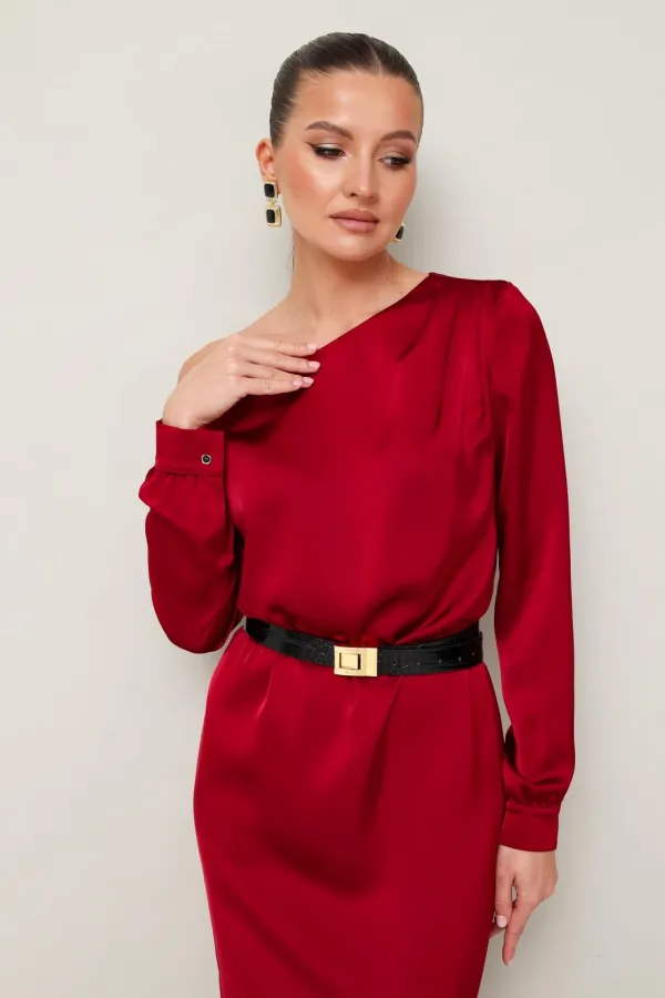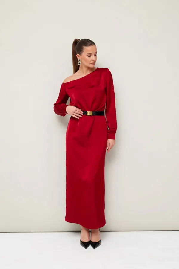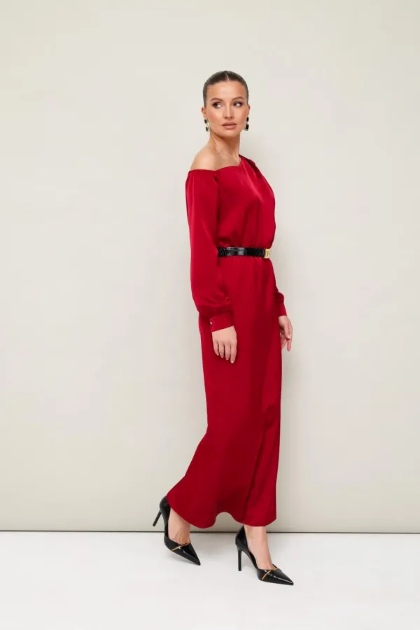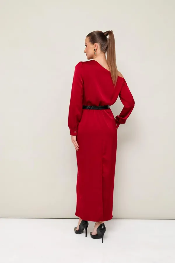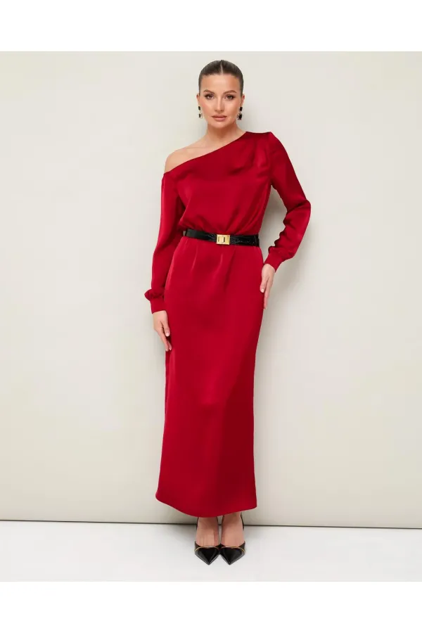 Вечернее платье полуприлегающего силуэта, выполнено из струящейся ткани с благородным матовым блеском. Ассиметричный вырез горловины с открытым плечом. Правый плечевой шов декорирован складками. Платье отрезное по линии талии на резинке. Рукава длиннные с манжетами с застежкой на петли и пуговицы. По спинке в среднем шве юбки обработан разрез.