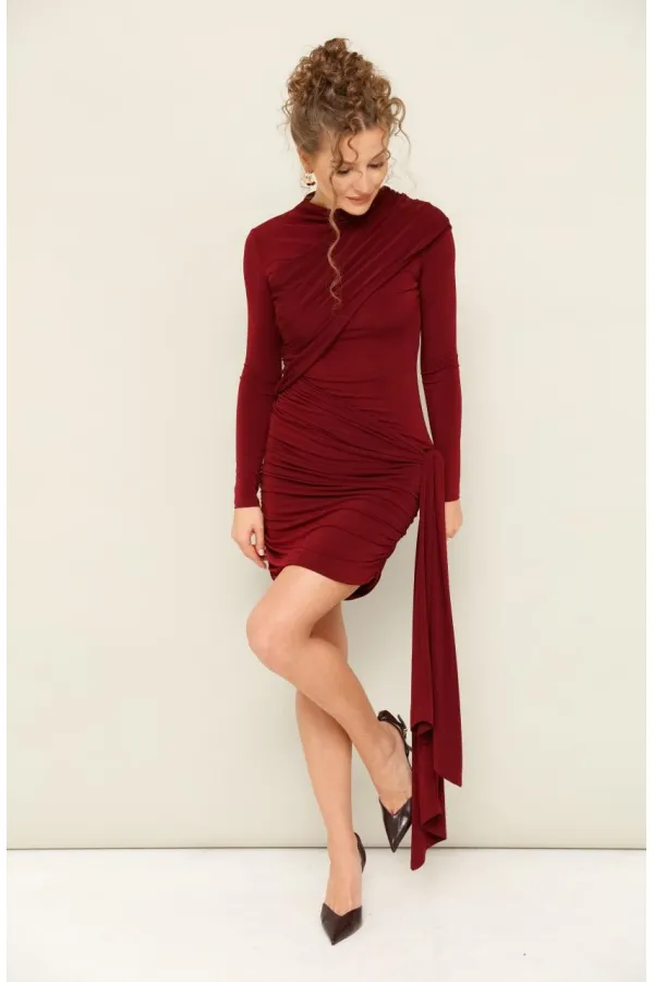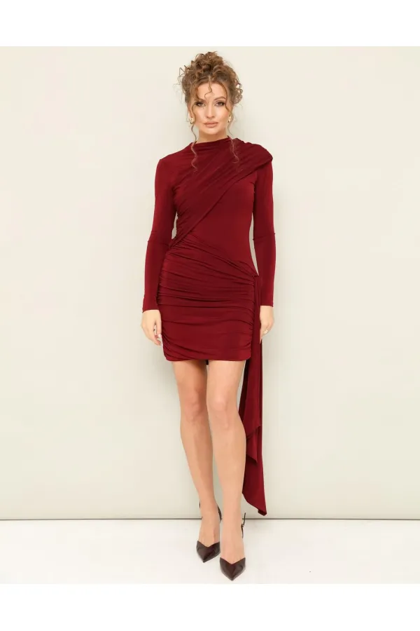 Платье прилегающего силуэта в длине мини, выполнено из эластичной ткани - масло. Горловина с цельнокроеной стойкой. Рукава длинные втачные. Перед и спинка декорированы диагональными деталями со сборкой в области лифа и бедер.