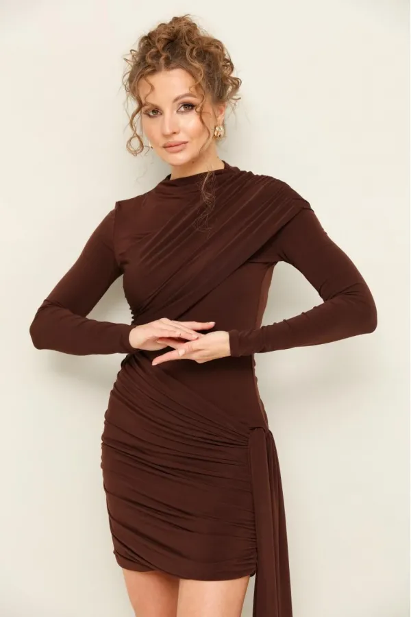 Платье прилегающего силуэта в длине мини, выполнено из эластичной ткани - масло. Горловина с цельнокроеной стойкой. Рукава длинные втачные. Перед и спинка декорированы диагональными деталями со сборкой в области лифа и бедер.