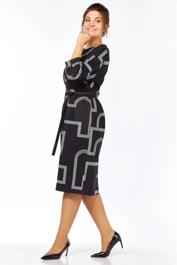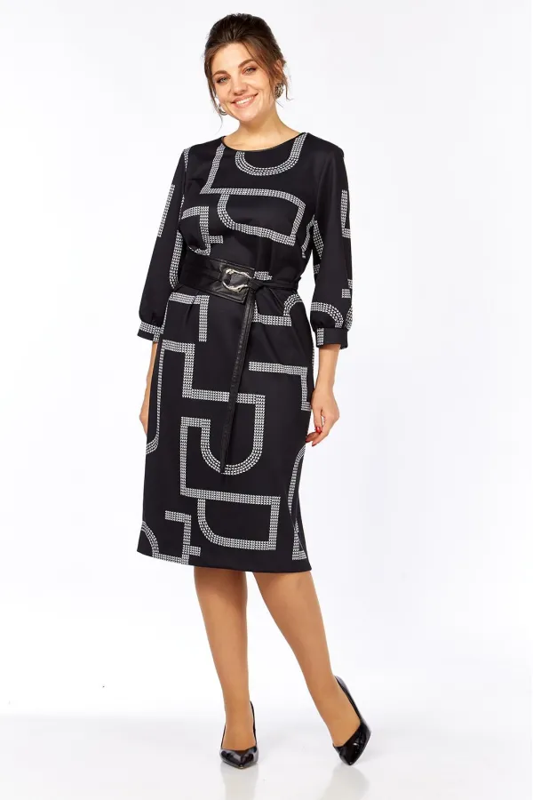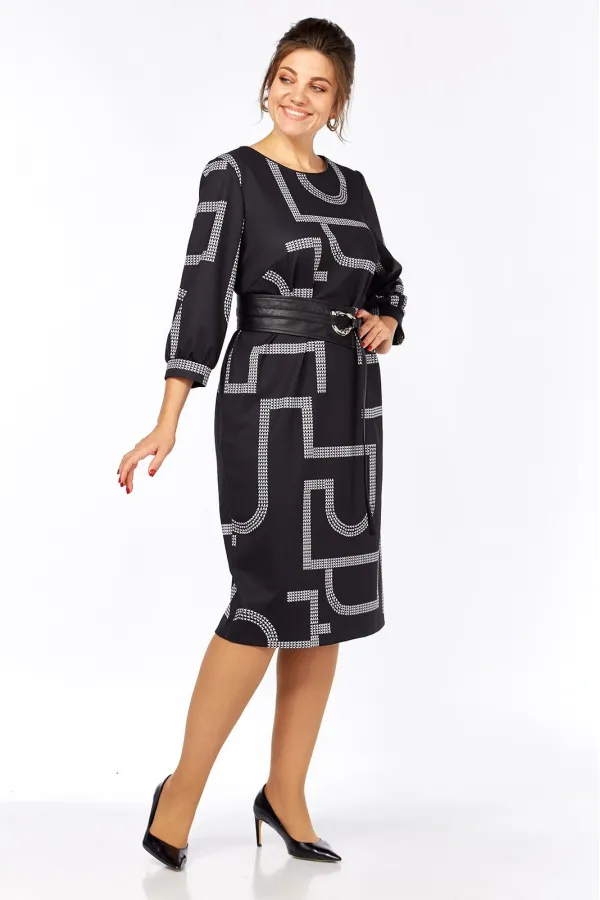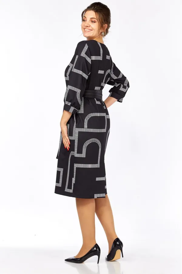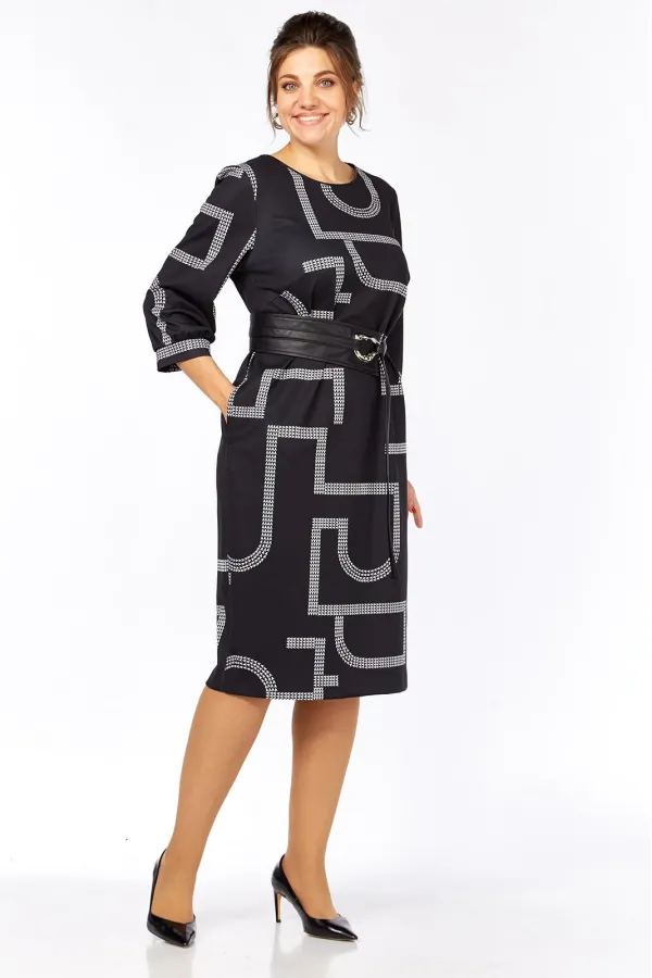 Платье женское прямого силуэта выполнено из высококачественного трикотажного полотна с дизайнерским принтом. В боковых швах имеются функциональные карманы. Перед с округлым вырезом, оформлен кожаным кантом. Спинка прямая со средним швом. Рукав одношовный втачной длиной ¾. В комплекте идет кожаный съемный пояс.