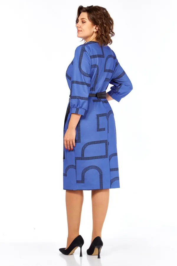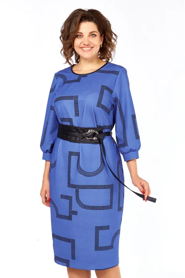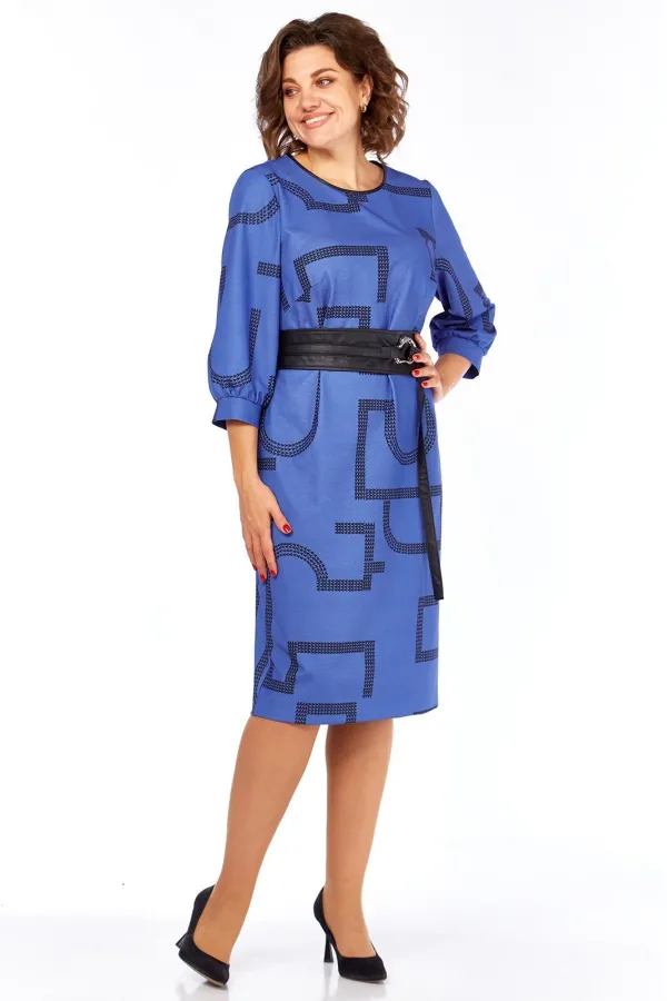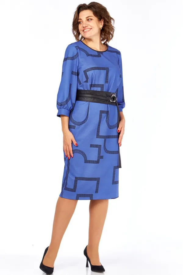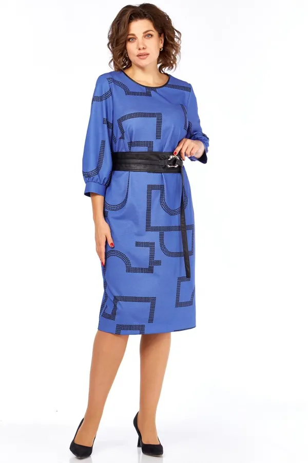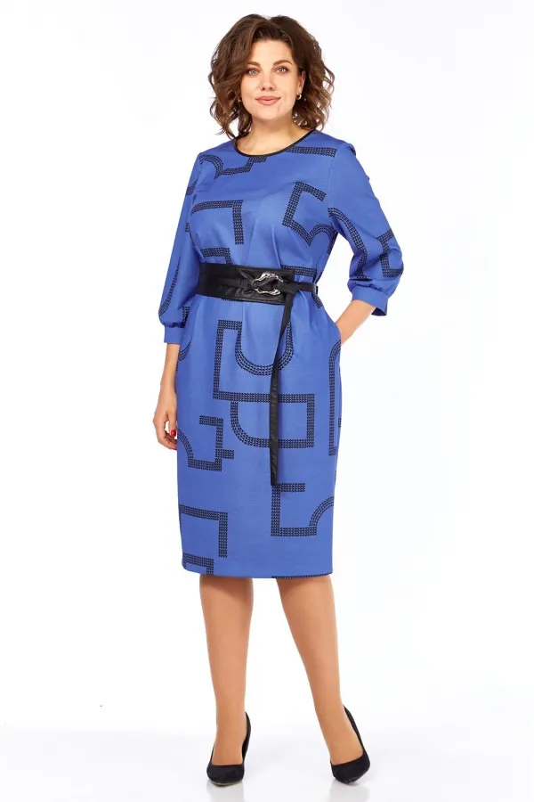 Платье женское прямого силуэта выполнено из высококачественного трикотажного полотна с дизайнерским принтом. В боковых швах имеются функциональные карманы. Перед с округлым вырезом, оформлен кожаным кантом. Спинка прямая со средним швом. Рукав одношовный втачной длиной ¾. В комплекте идет кожаный съемный пояс.