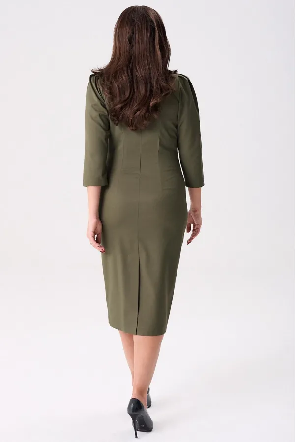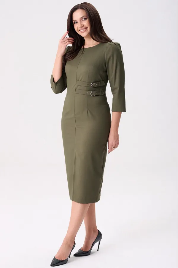Платье женское прямого силуэта выполнено из плательной ткани. Платье с округлой горловиной. По переду платья расположены талиевые выточки и средний шов, переходящий к низу в разрез, придающий нотку игривости и удобства. Сбоку по переду платья имеется два декоративных хлястика с пряжками. Спинка прямая разрезная на потайную застежку-молнию и талиевыми выточками. Рукав прямой втачной, длиной 7/8, одношовный, со складками по окату.