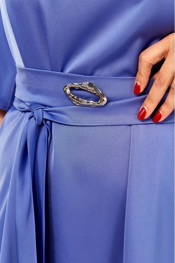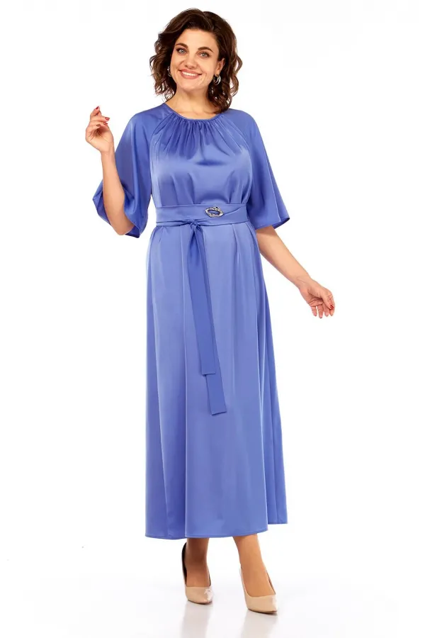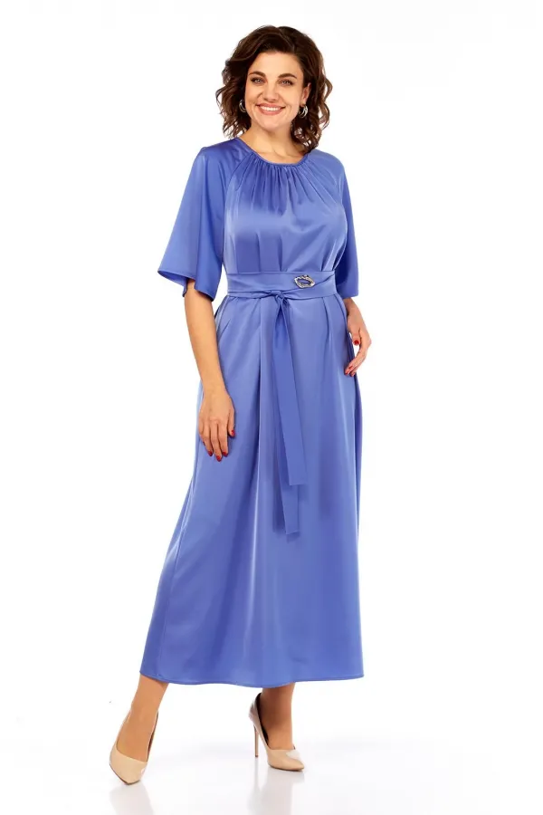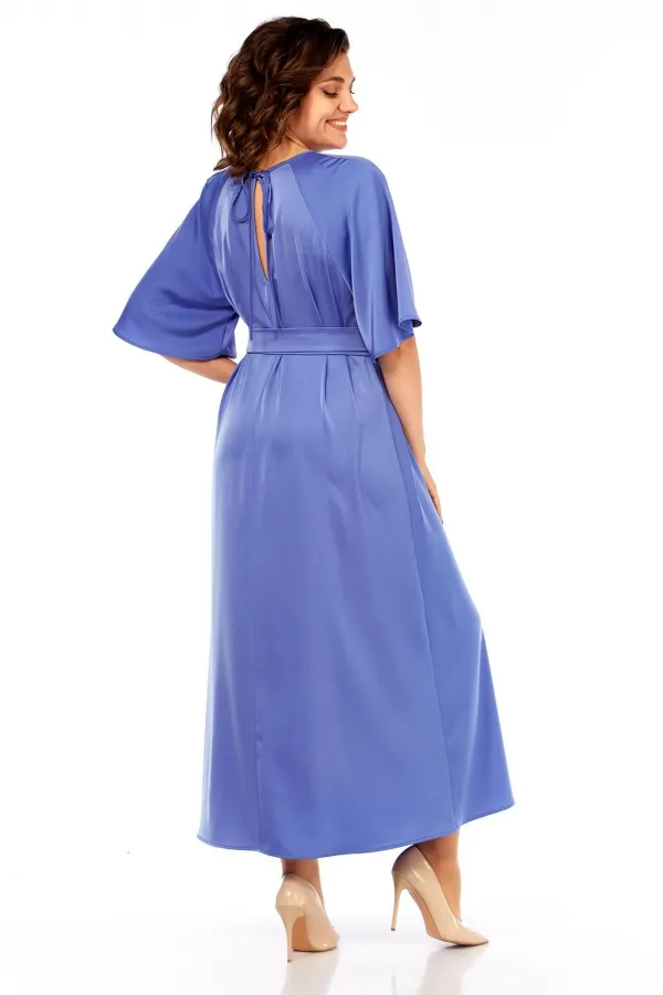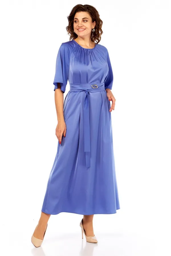 Сочетание элегантности и изысканности. Минималистичное по крою платье длины макси из двустороннего сатина. Вырез горловины округлый, спереди на сборке. Рукав реглан, расширенный к низу. Спинка со средним швом и углубленным разрезом сверху. Линия талии дополнительно подчёркивается поясом с декоративной фурнитурой.