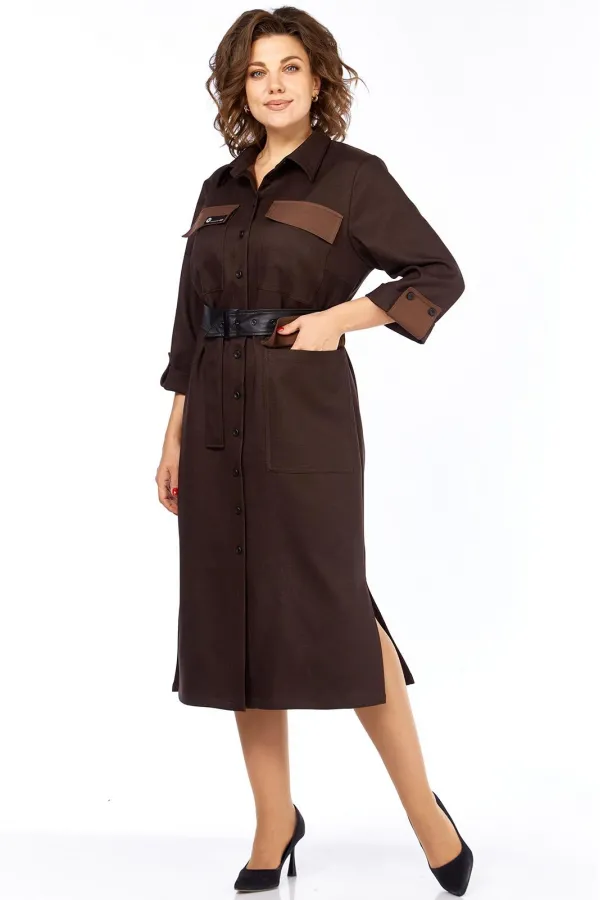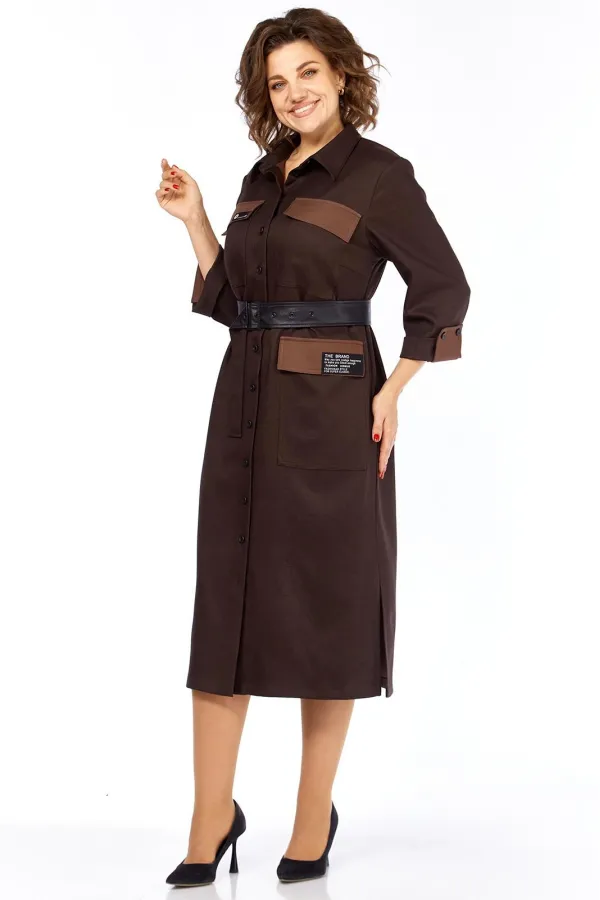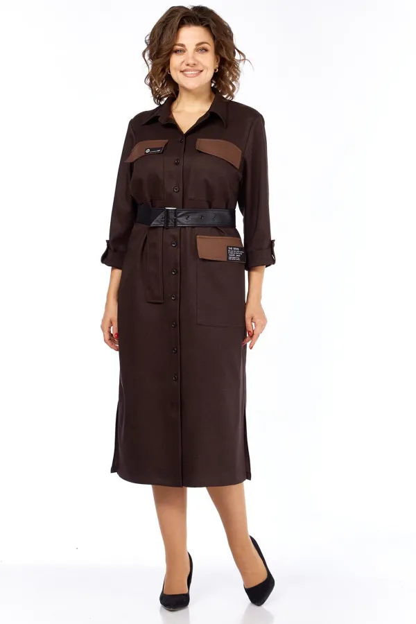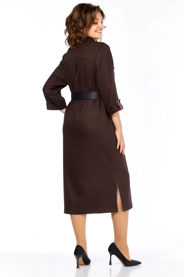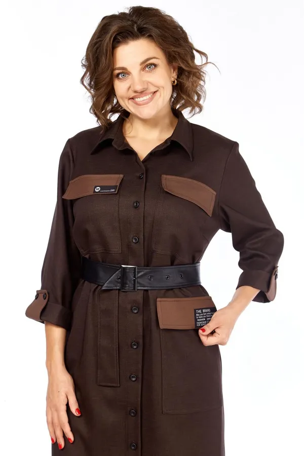 Современное платье прямого силуэта в стиле сафари. Отличный выбор для Вас в любое время года! По переду платья расположены два накладных нагрудных кармана с клапанами и один - по боковому переда. Центр платья на планке, застегивающейся на петли-пуговицы до низа. Спинка с кокеткой и средним швом. Боковой шов платья с разрезами внизу. Горловина с рубашечным воротником на притачной стойке. Рукав одношовный длиной 7/8 с декоративной планкой. Платье дополняет съемный пояс, подчеркивающий талию.