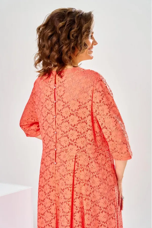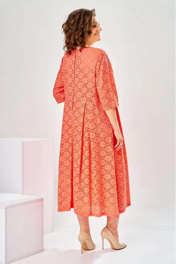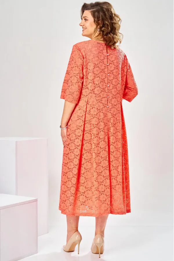 Платье женское отрезное по линии талии, предназначено для торжественного выхода. Перед: верхняя часть с двумя талиевыми вытачками, нижняя часть с тремя встречными бантовыми складками. Горловина круглая, обтачная, без воротника. Застежка на 7 пришивных пуговиц в среднем шве спинки. Рукав втачной, одно шовный, длиной 3/4. Платье на подкладке с плечевыми накладками. Длина спинки 120 см . Длина рукава 39 см
