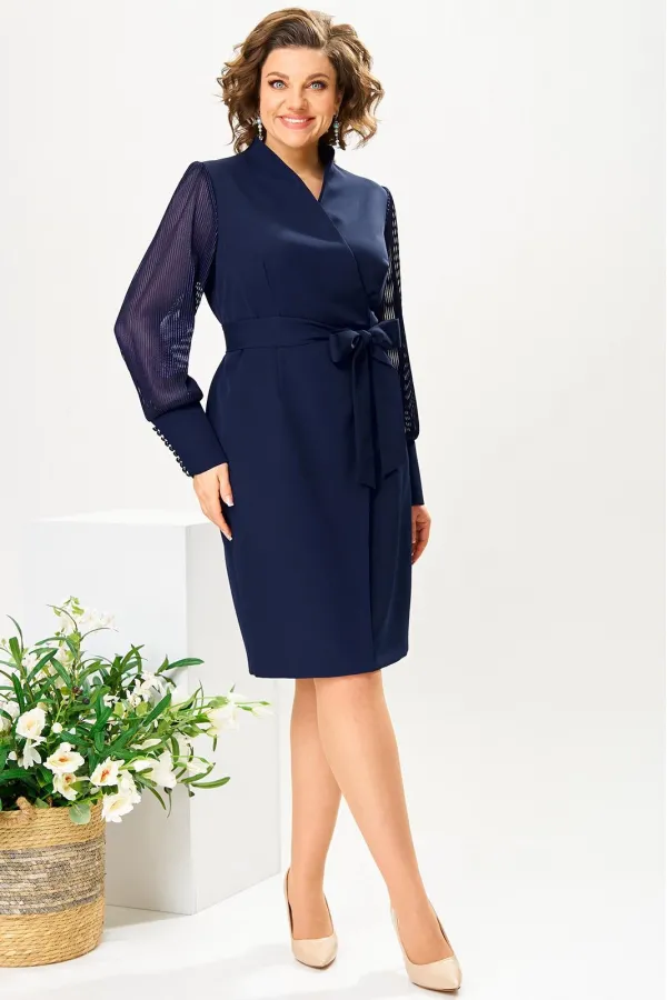 Платье женское, полу прилегающего силуэта, длиной за колено. Перед отрезной по линии талии. Верхняя часть переда с 2-мя талиевыми вытачками. Нижняя часть с 2-мя талиевыми вытачками и с запахом. Спинка со средним швом и 2-мя талиевыми вытачками. Горловина с цельнокроеной обтачкой стойкой, с фигурным вырезом с запахом. Застежка на потайную тесьму-молнию в левом боковом шве платья. Рукав втачной, одно шовный, длинный из отделочной ткани, по окату и низу рукава легкая сборка. Рукав с притачной манжетой с застежкой на 10 пришивных пуговиц. Платье с плечевыми накладками. Платье со съёмным поясом. Длина спинки 100 см. Длина рукава 61 см